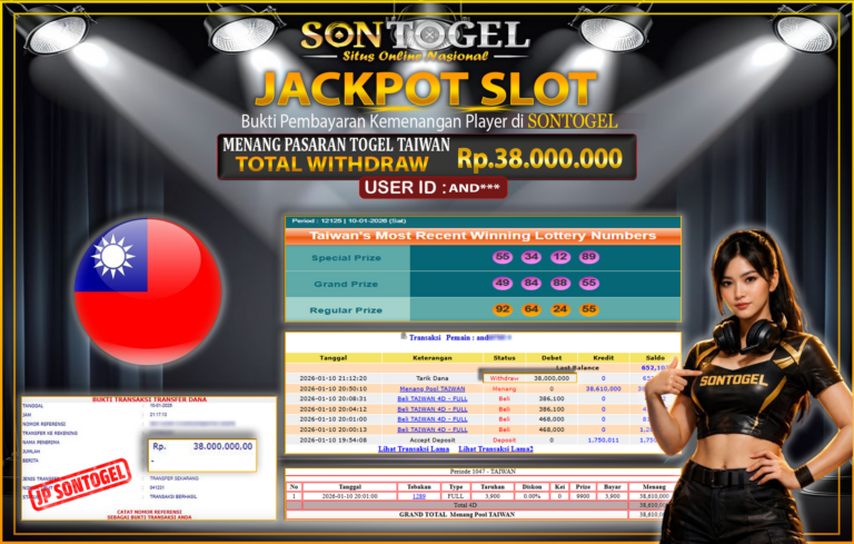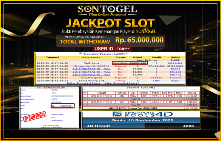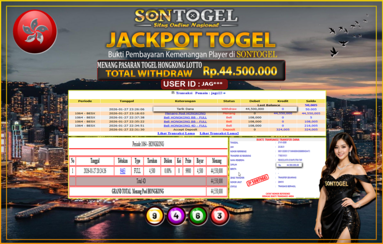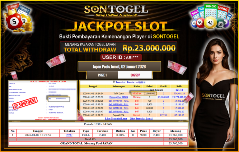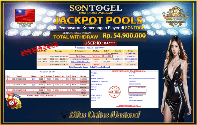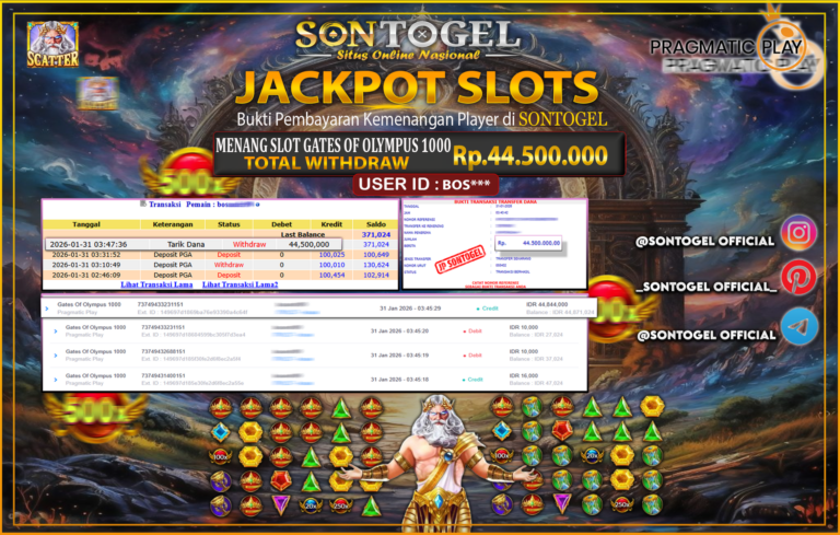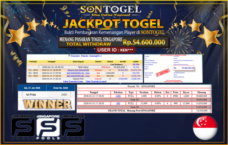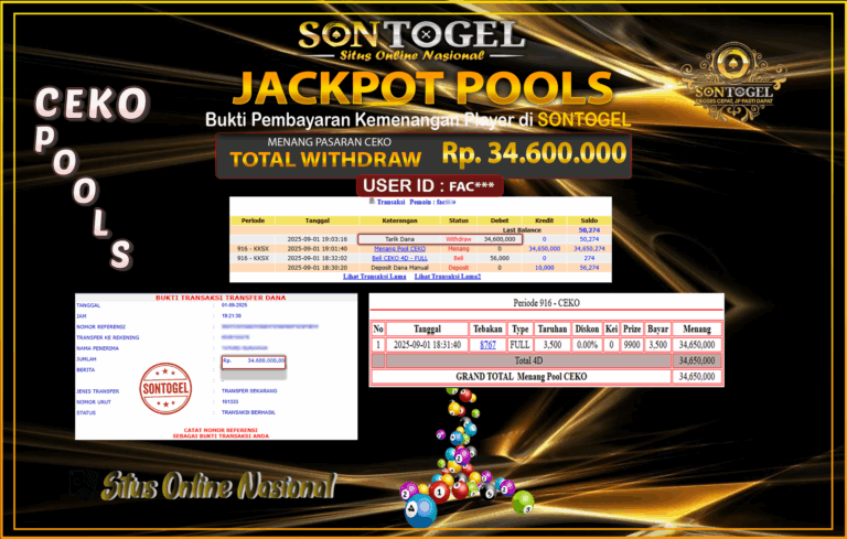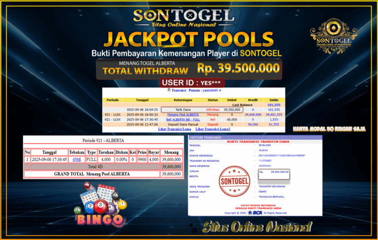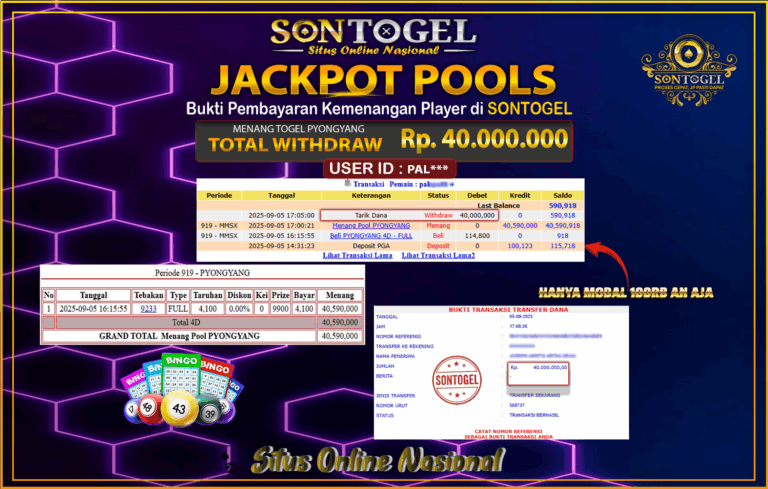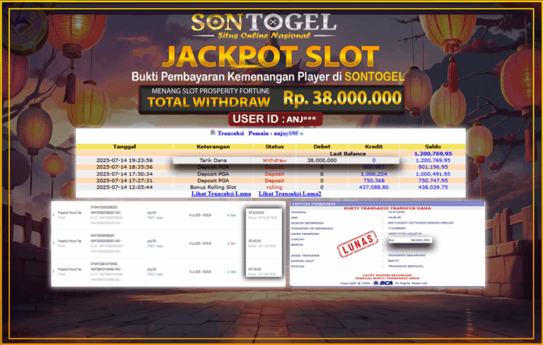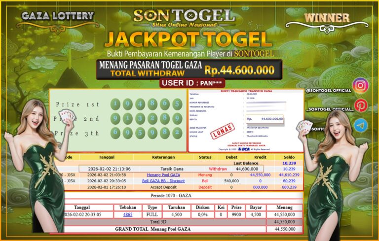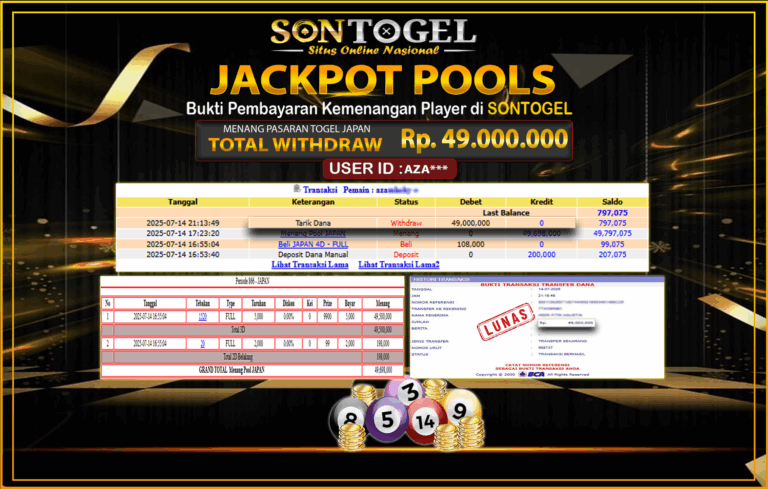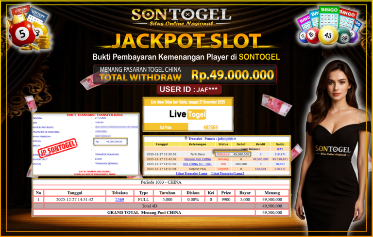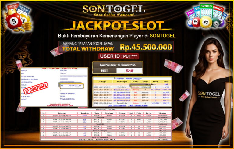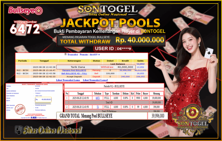 BUKTI JP SONTOGEL – Situs Togel Online, Live Casino dan Slot Online Terpercaya yang terbukti membayar berapapun kemenangan Anda tanpa kekurangan sepeserpun. Jika Anda masih mencari Situs Terpercaya, jangan ragu untuk bermain di SONTOGEL. Dalam 1 akun Anda bisa menikmati semua permainan dengan minimal deposit hanya Rp. 5.000,- saja. Berbagai pasaran togel resmi bisa Anda…