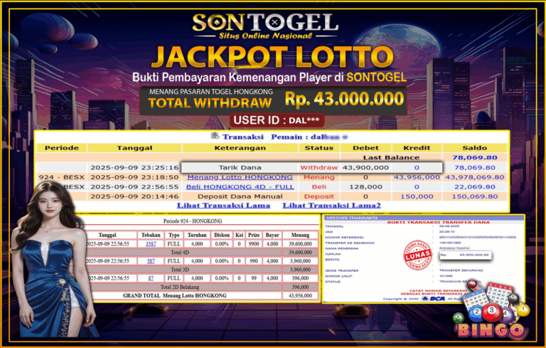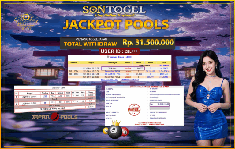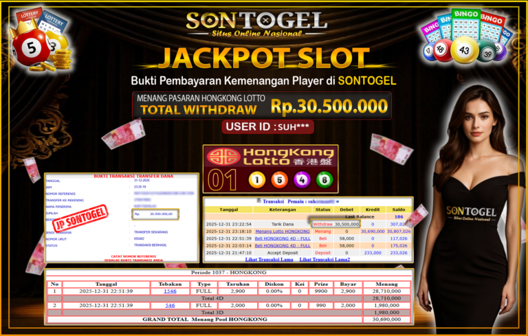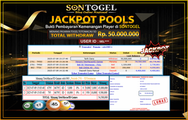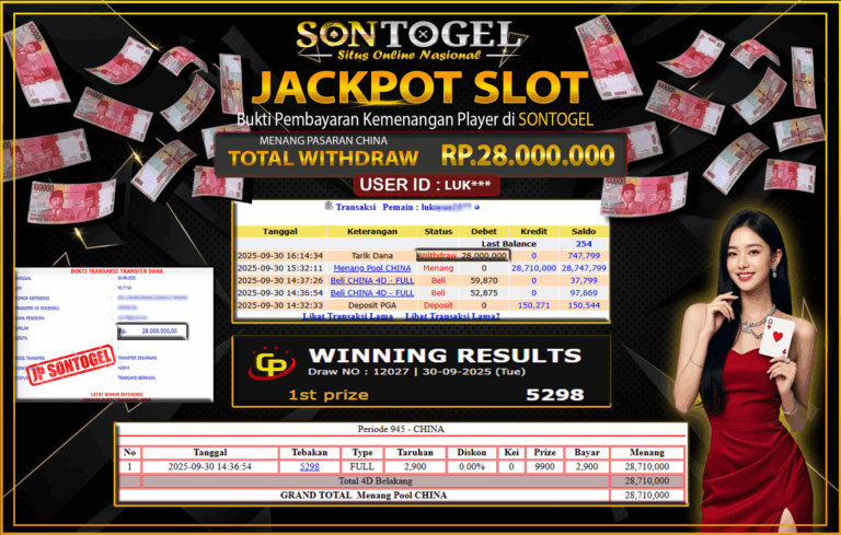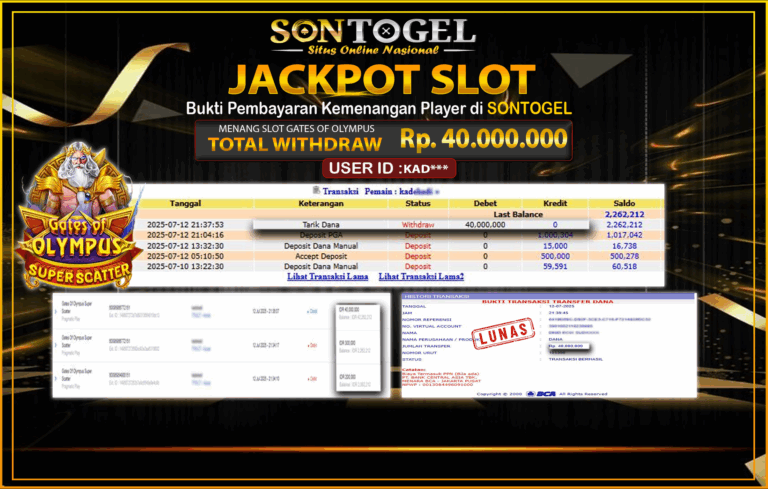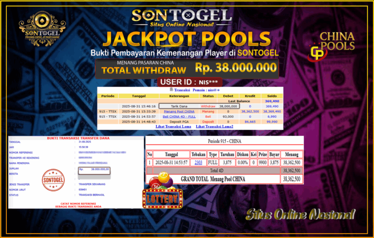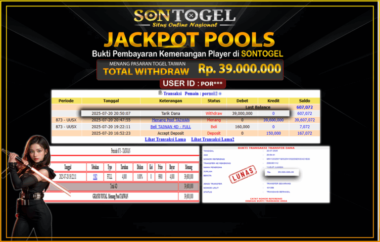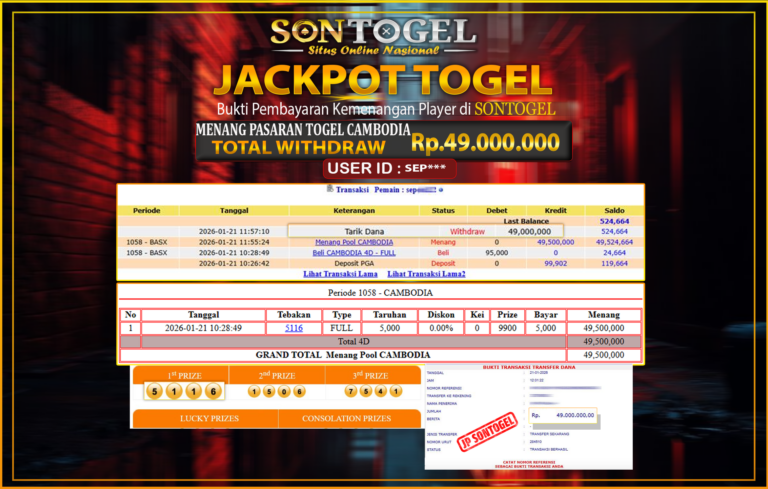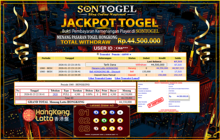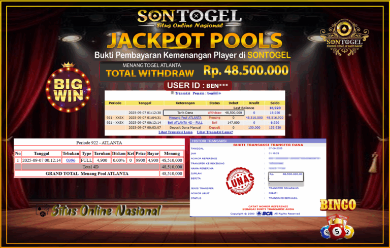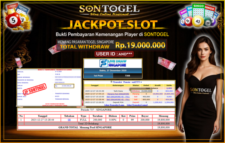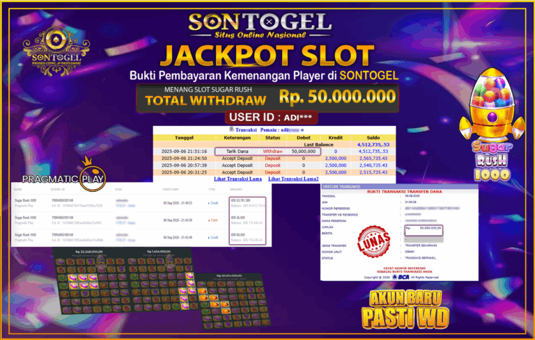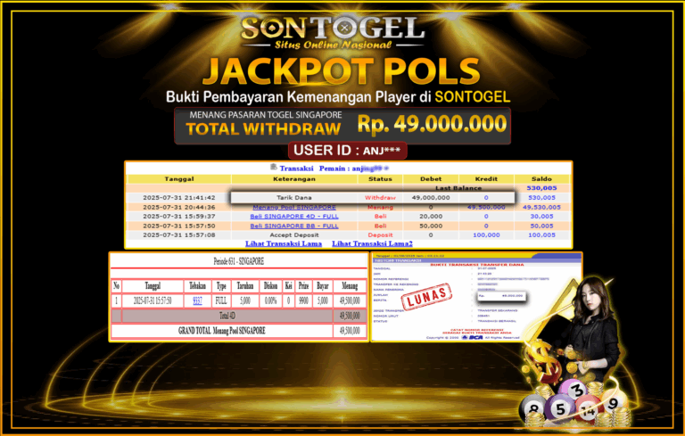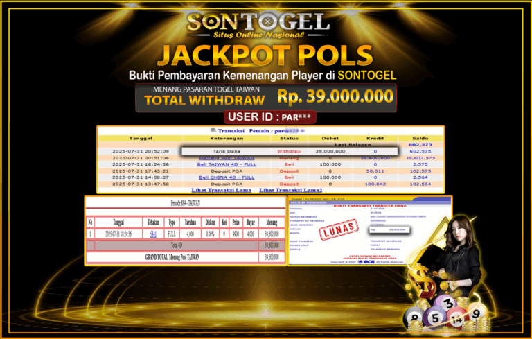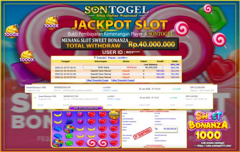 BUKTI JP SONTOGEL – Situs Togel Online, Live Casino dan Slot Online Terpercaya yang terbukti membayar berapapun kemenangan Anda tanpa kekurangan sepeserpun. Jika Anda masih mencari Situs Terpercaya, jangan ragu untuk bermain di SONTOGEL. Dalam 1 akun Anda bisa menikmati semua permainan dengan minimal deposit hanya Rp. 5.000,- saja. Berbagai pasaran togel resmi bisa Anda…