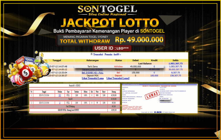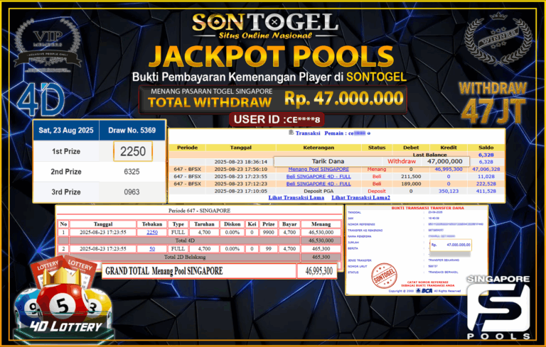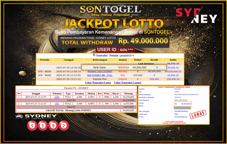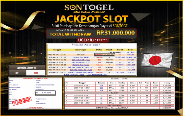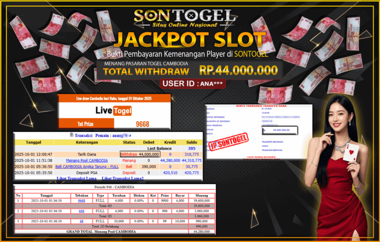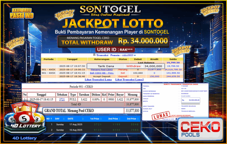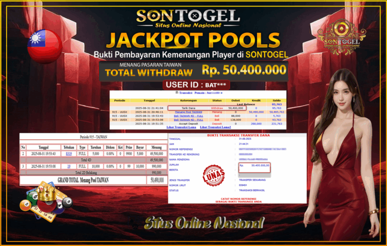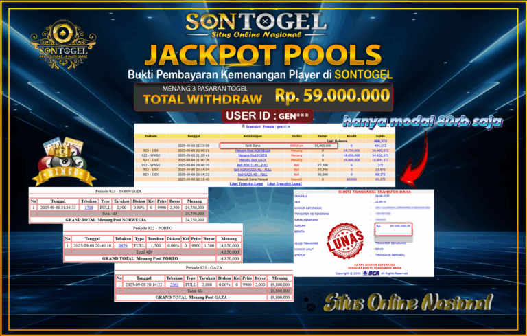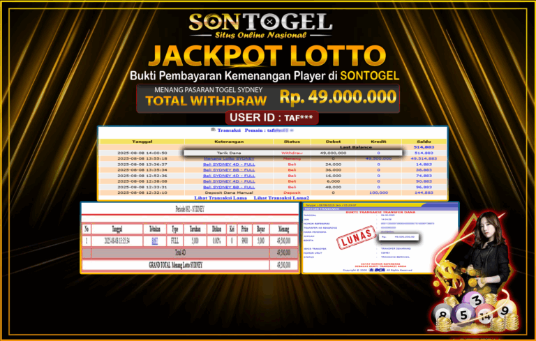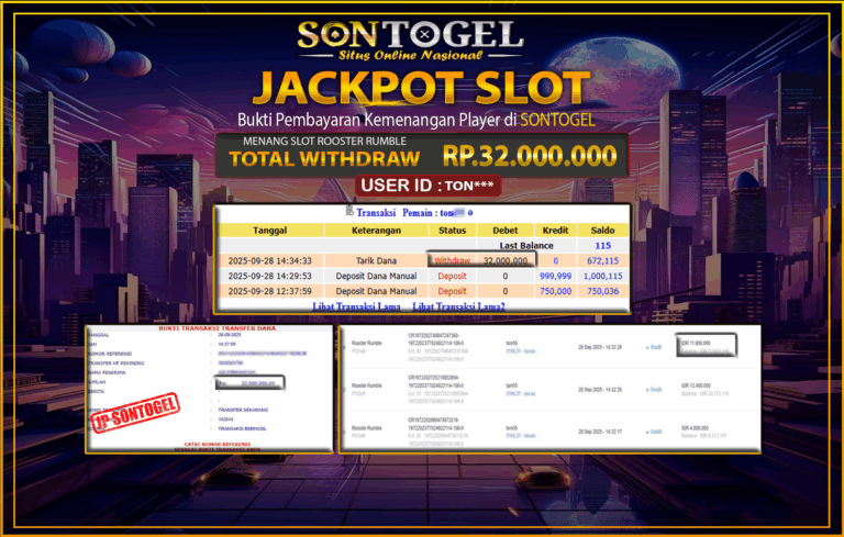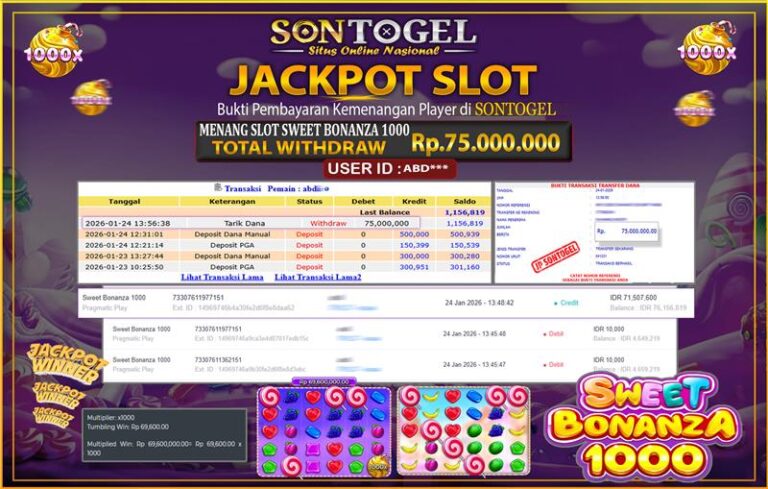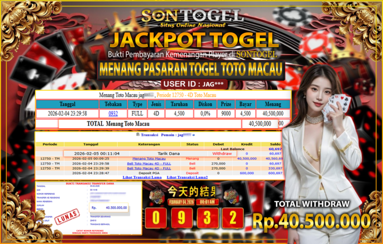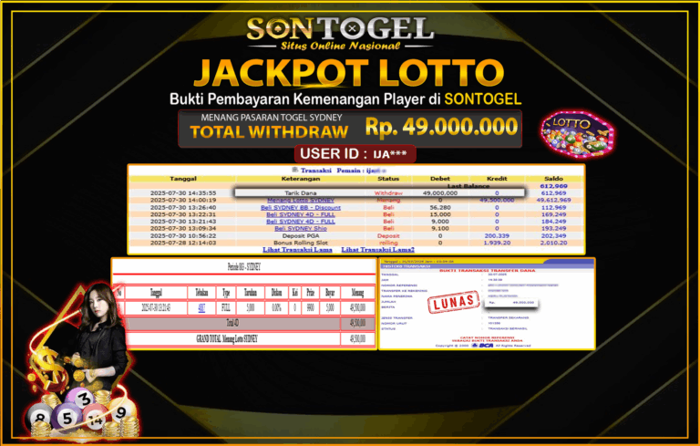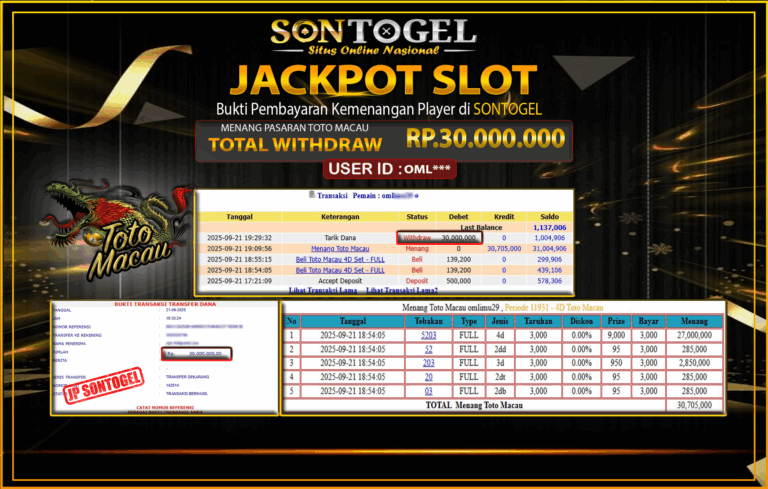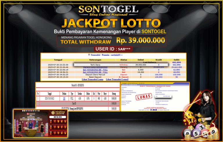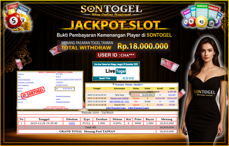 BUKTI JP SONTOGEL – Situs Togel Online, Live Casino dan Slot Online Terpercaya yang terbukti membayar berapapun kemenangan Anda tanpa kekurangan sepeserpun. Jika Anda masih mencari Situs Terpercaya, jangan ragu untuk bermain di SONTOGEL. Dalam 1 akun Anda bisa menikmati semua permainan dengan minimal deposit hanya Rp. 5.000,- saja. Berbagai pasaran togel resmi bisa Anda…