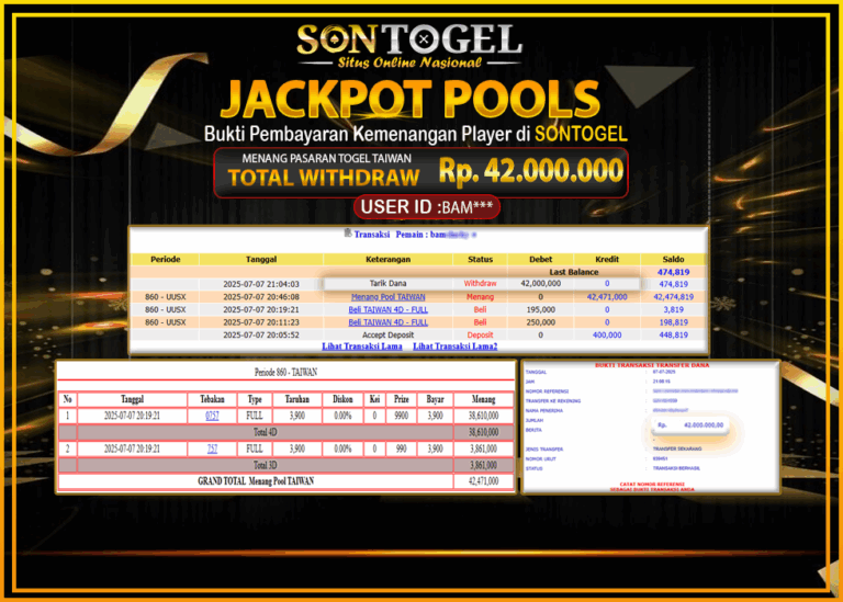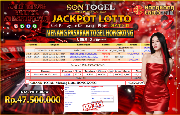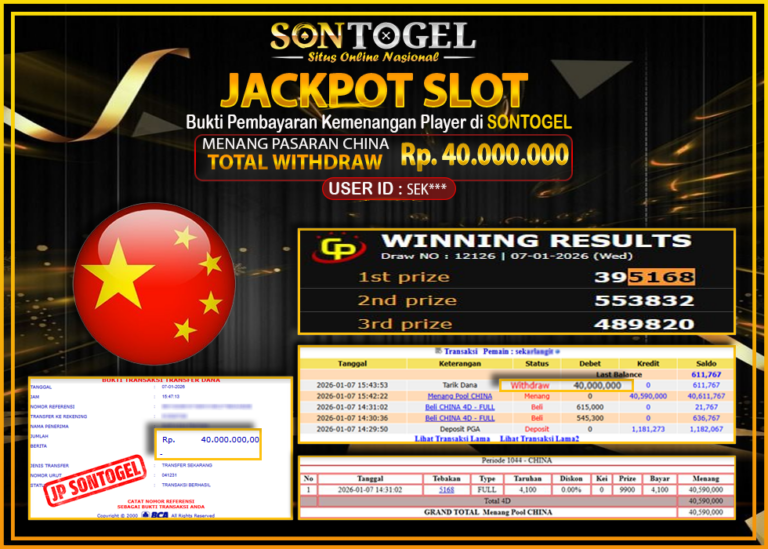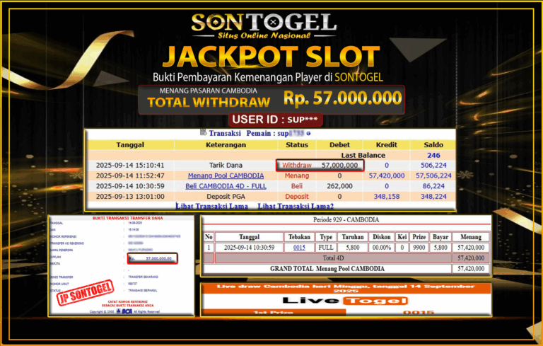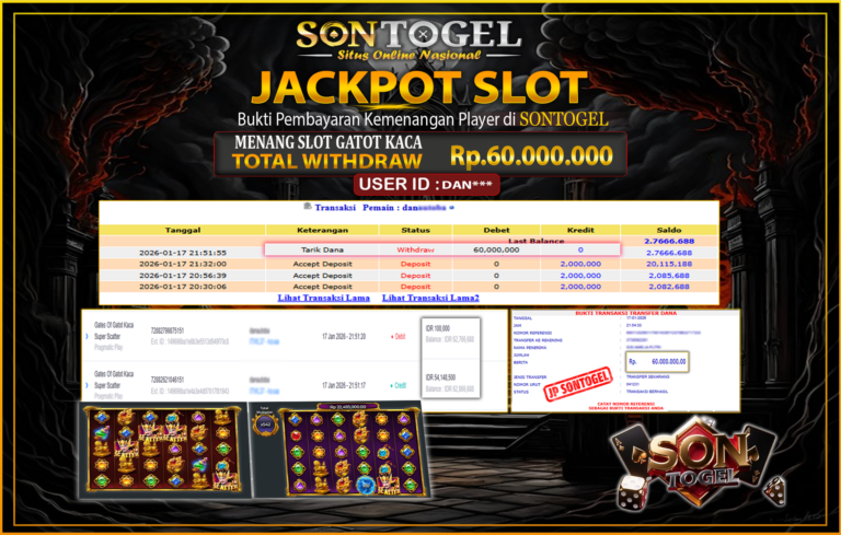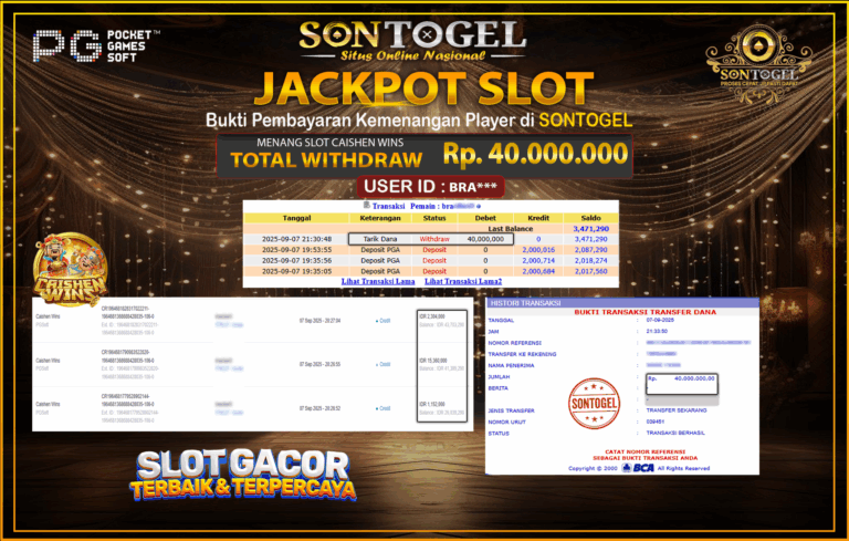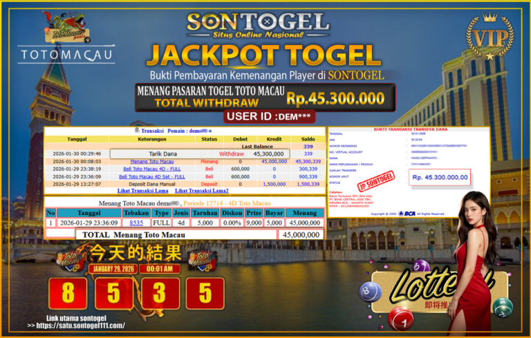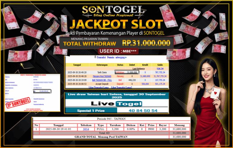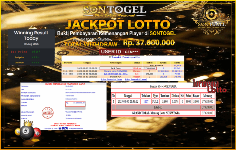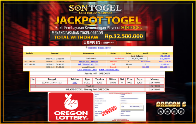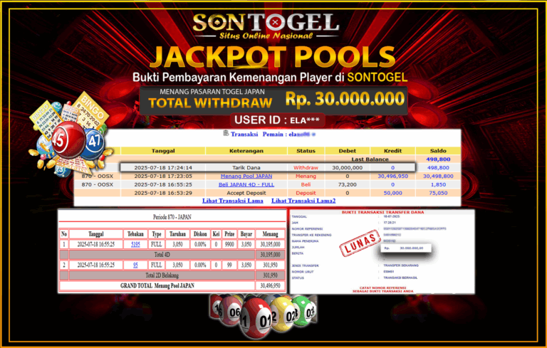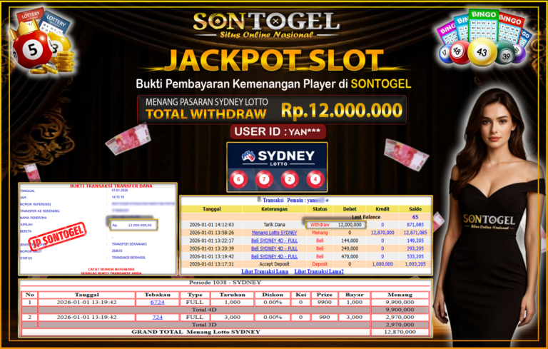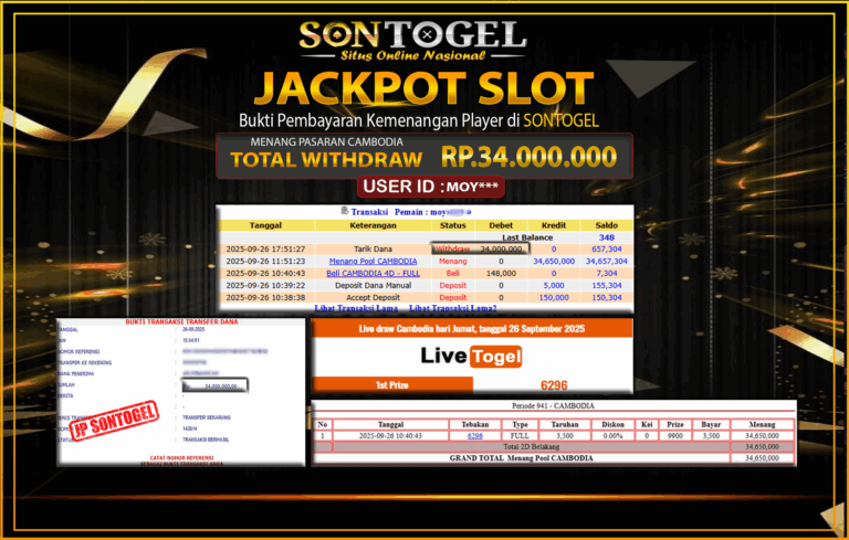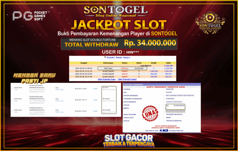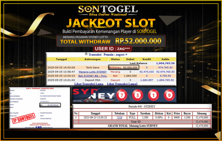 BUKTI JP SONTOGEL – Situs Togel Online, Live Casino dan Slot Online Terpercaya yang terbukti membayar berapapun kemenangan Anda tanpa kekurangan sepeserpun. Jika Anda masih mencari Situs Terpercaya, jangan ragu untuk bermain di SONTOGEL. Dalam 1 akun Anda bisa menikmati semua permainan dengan minimal deposit hanya Rp. 5.000,- saja. Berbagai pasaran togel resmi bisa Anda…