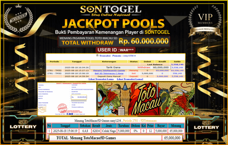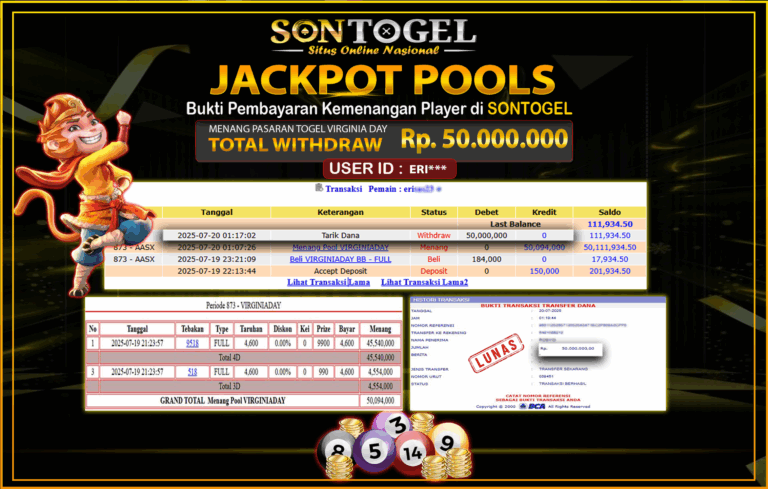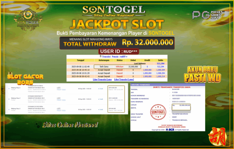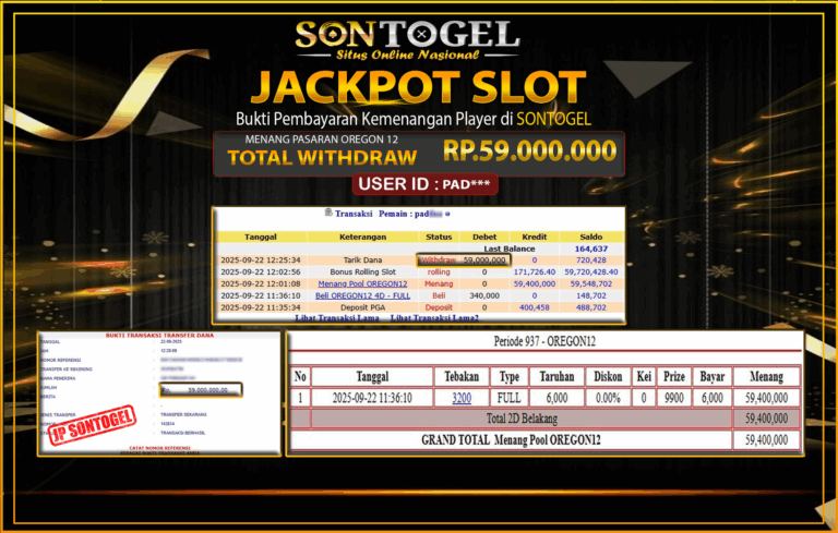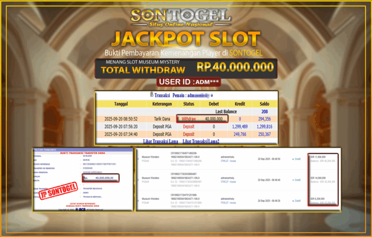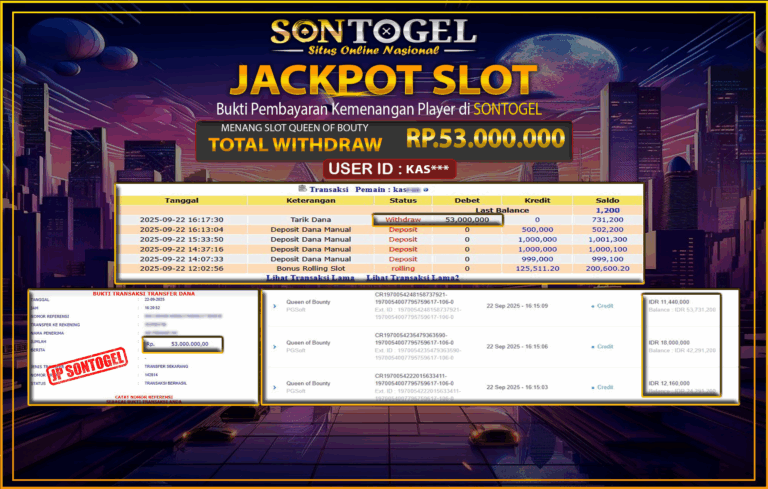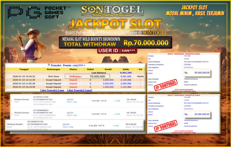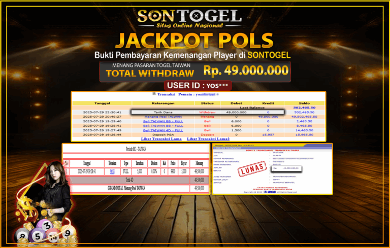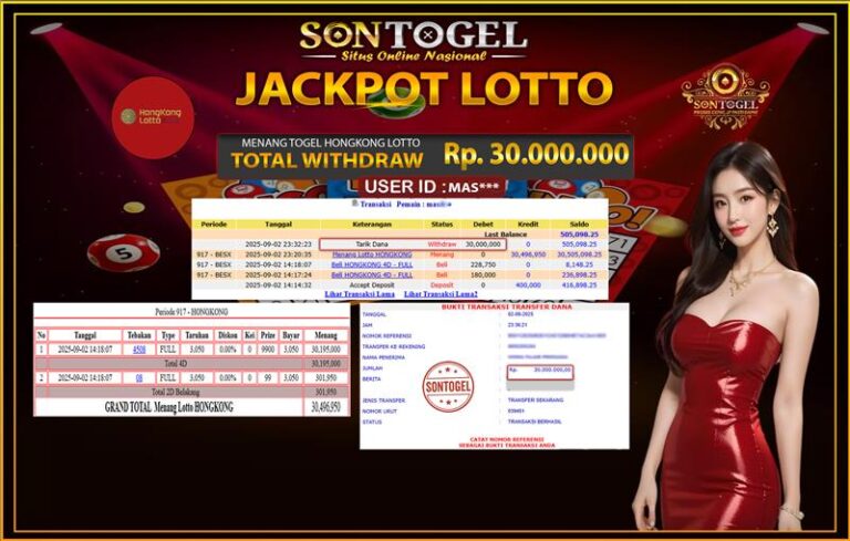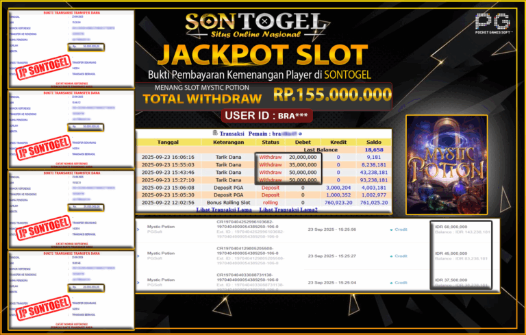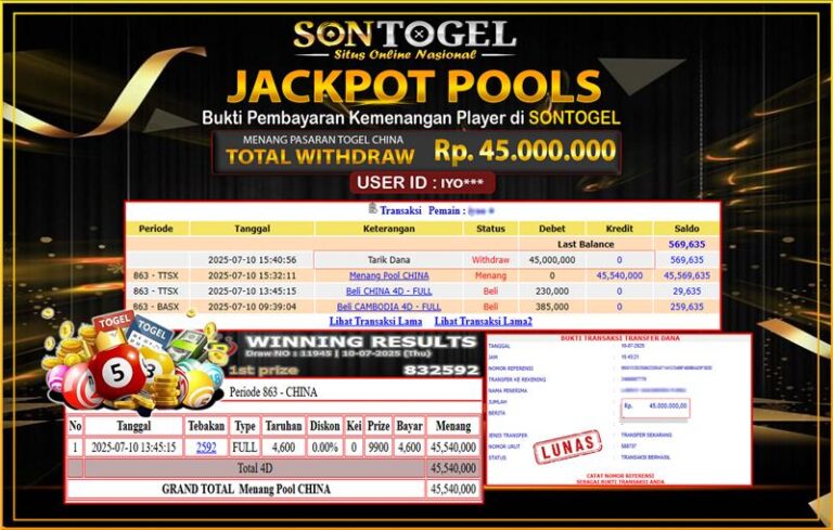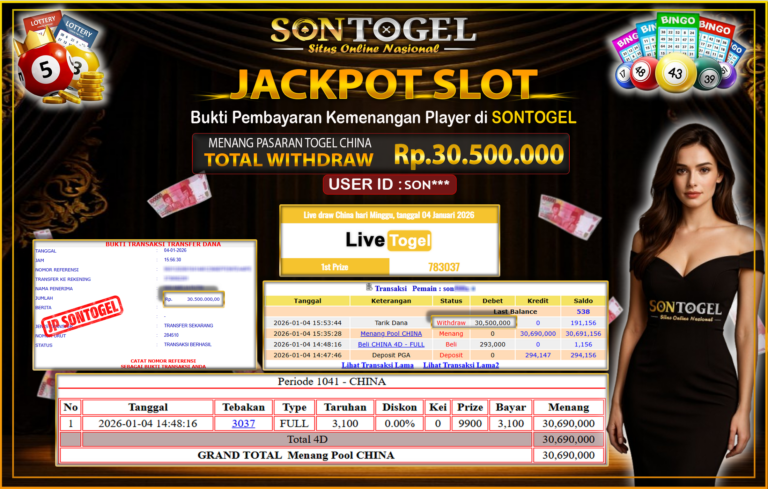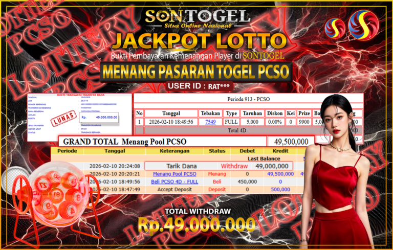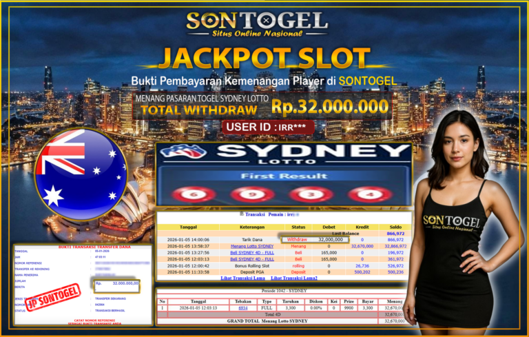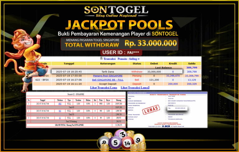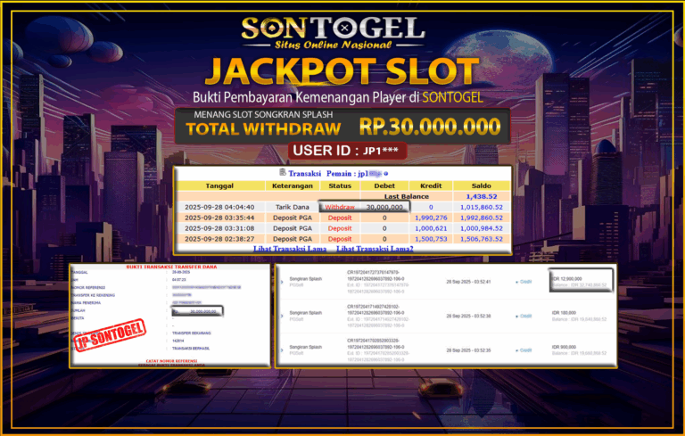 BUKTI JP SONTOGEL – Situs Togel Online, Live Casino dan Slot Online Terpercaya yang terbukti membayar berapapun kemenangan Anda tanpa kekurangan sepeserpun. Jika Anda masih mencari Situs Terpercaya, jangan ragu untuk bermain di SONTOGEL. Dalam 1 akun Anda bisa menikmati semua permainan dengan minimal deposit hanya Rp. 5.000,- saja. Berbagai pasaran togel resmi bisa Anda…