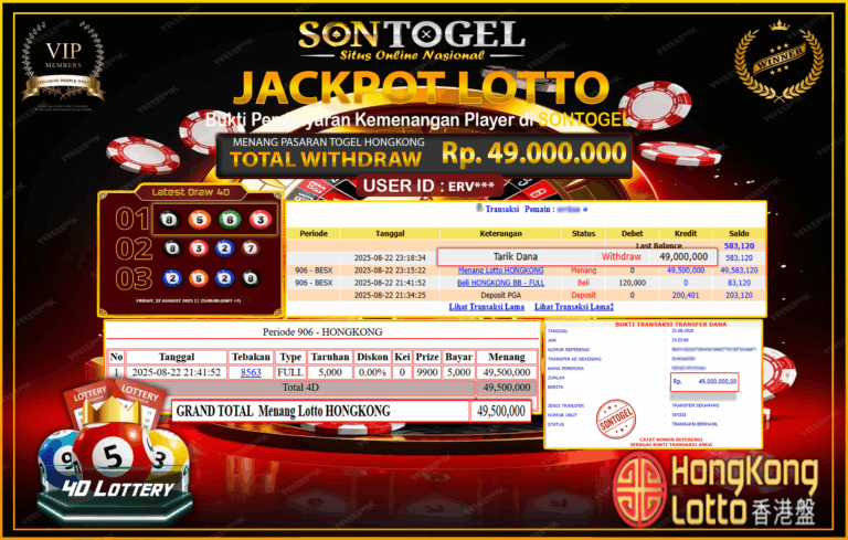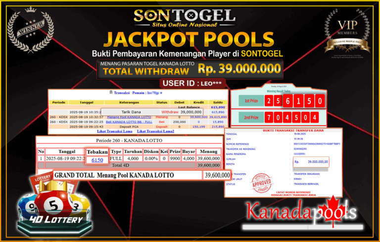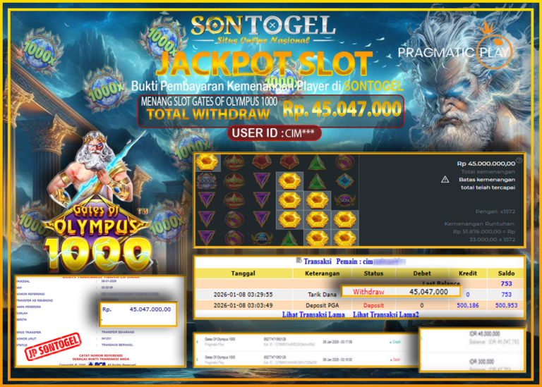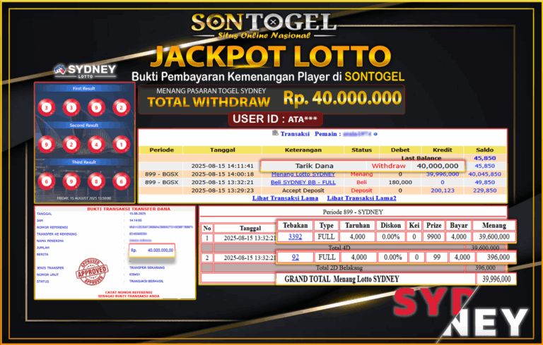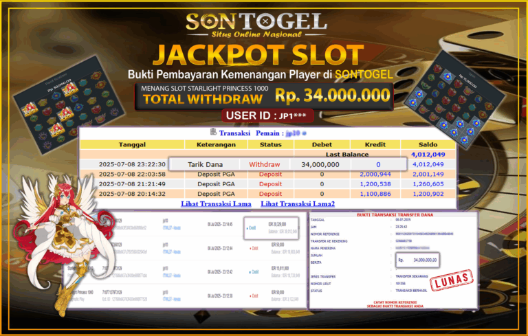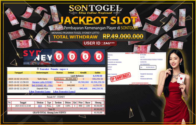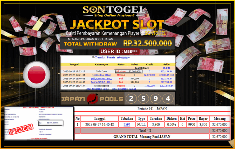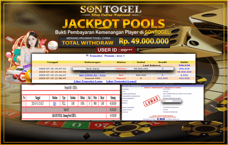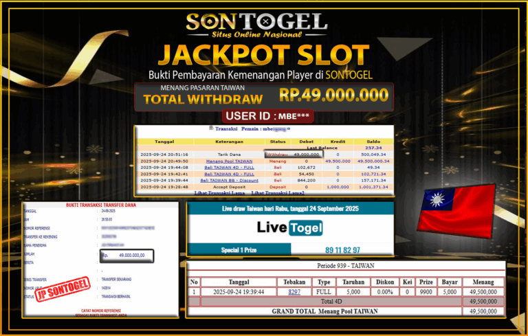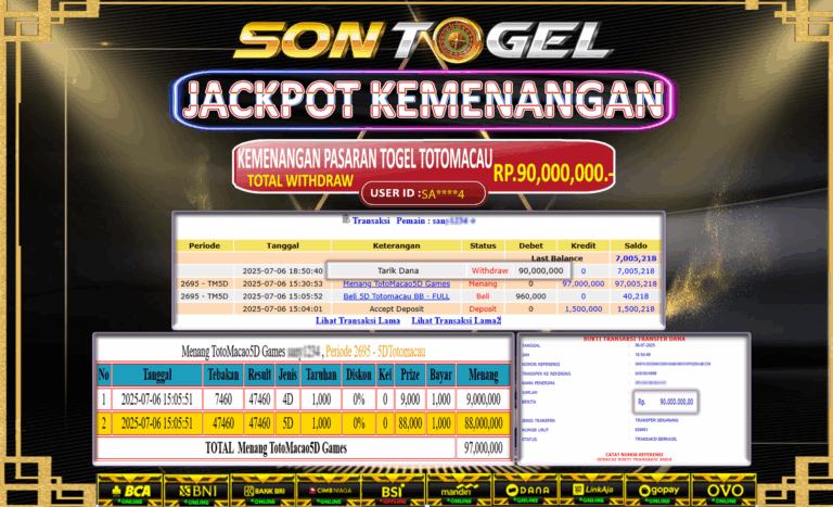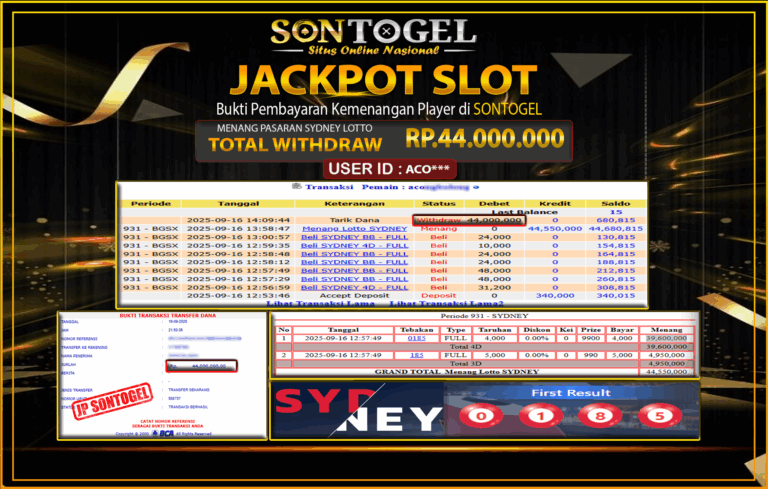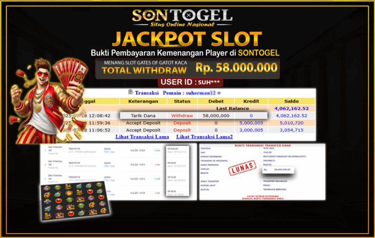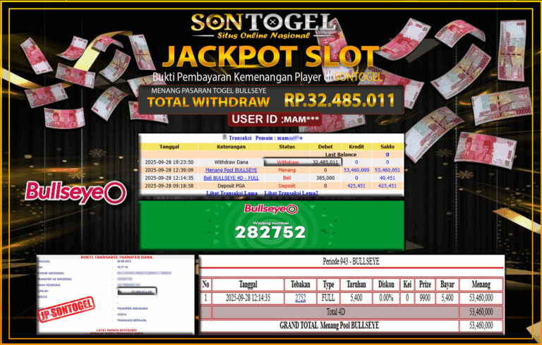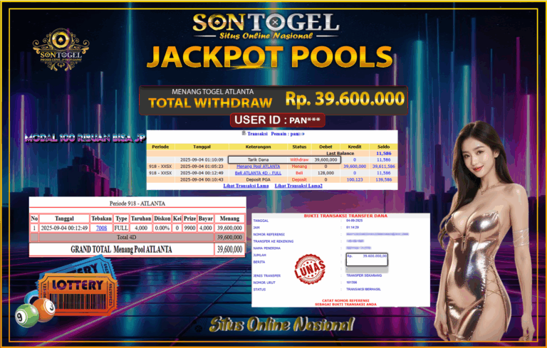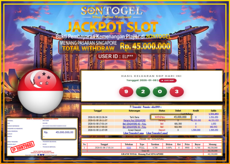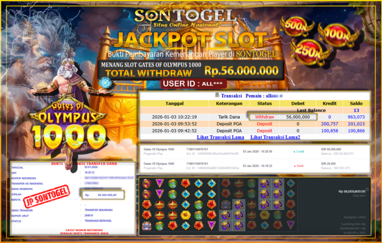 BUKTI JP SONTOGEL – Situs Togel Online, Live Casino dan Slot Online Terpercaya yang terbukti membayar berapapun kemenangan Anda tanpa kekurangan sepeserpun. Jika Anda masih mencari Situs Terpercaya, jangan ragu untuk bermain di SONTOGEL. Dalam 1 akun Anda bisa menikmati semua permainan dengan minimal deposit hanya Rp. 5.000,- saja. Berbagai pasaran togel resmi bisa Anda…