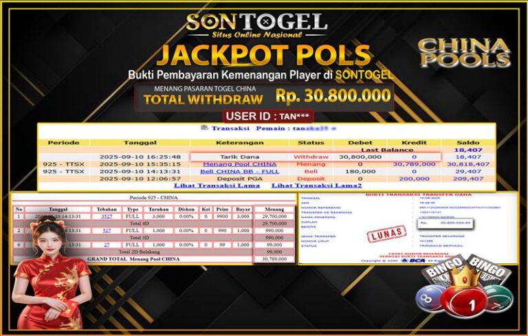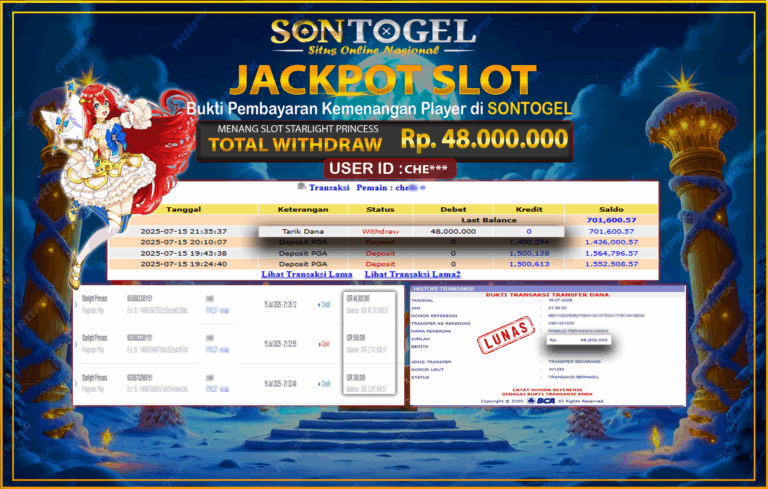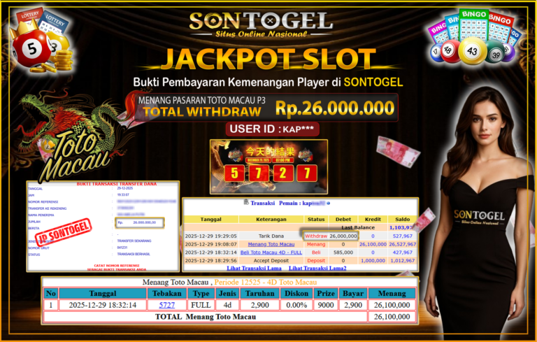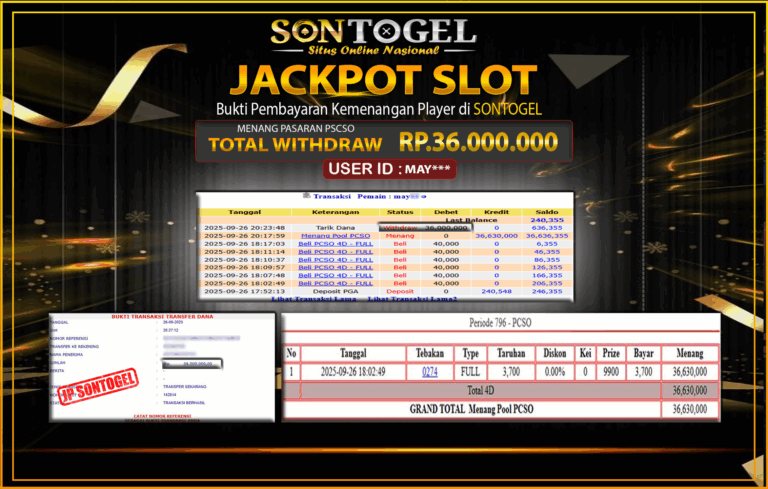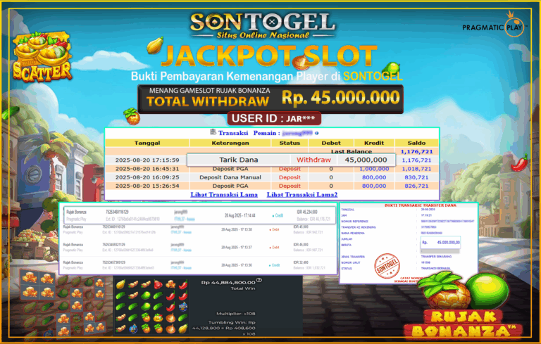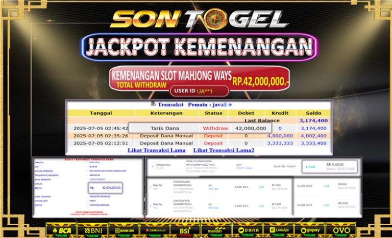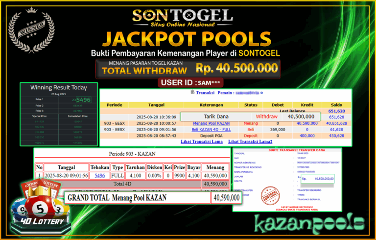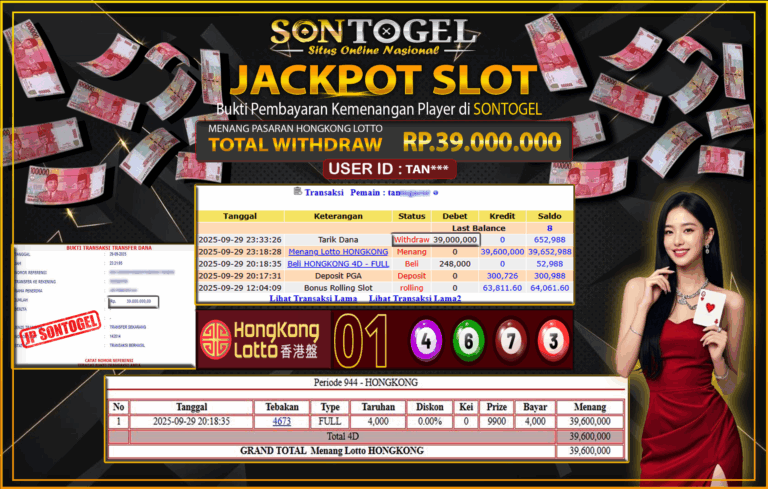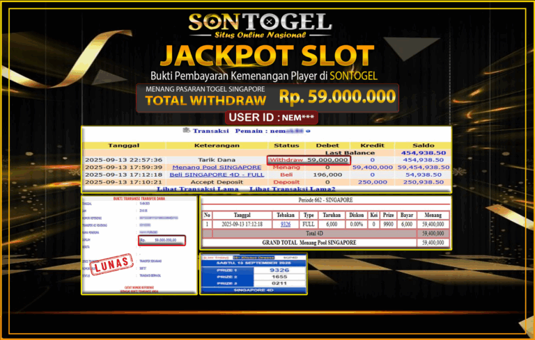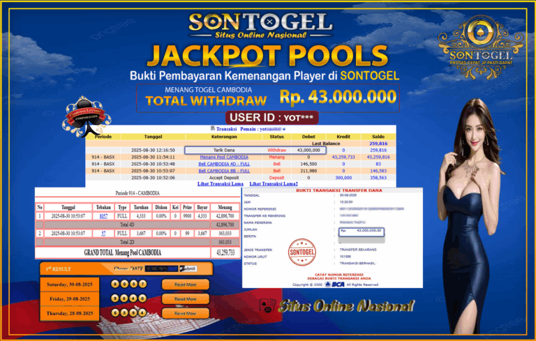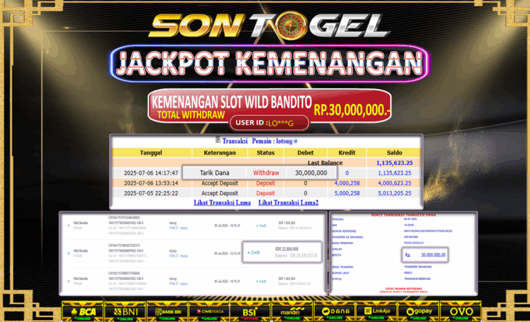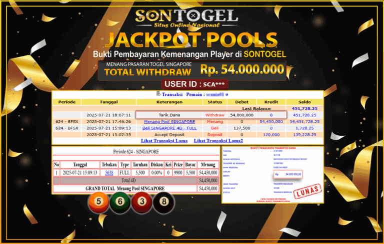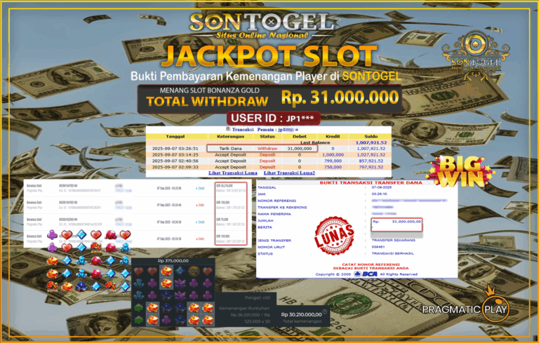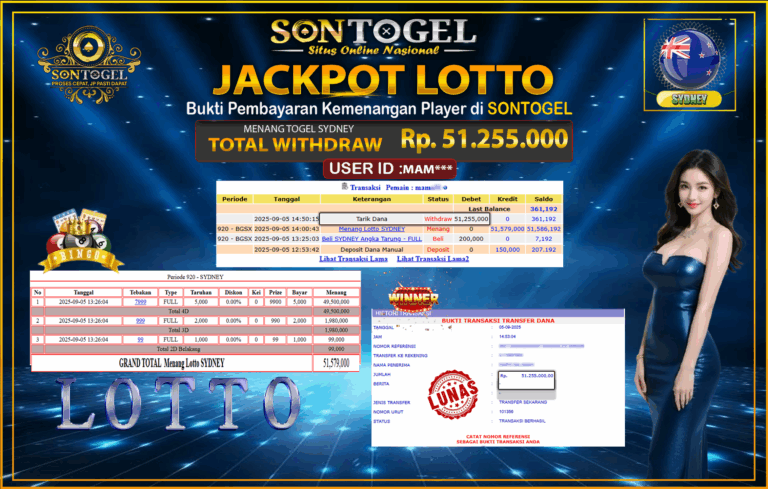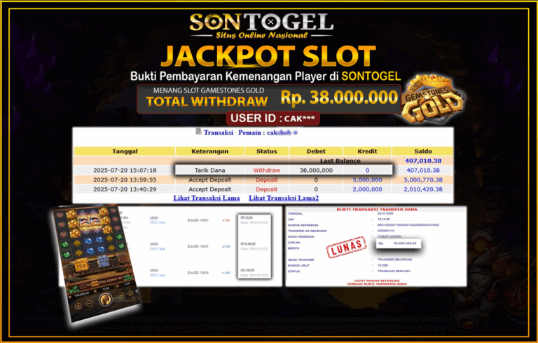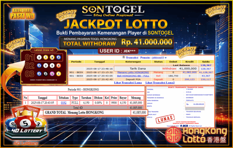 BUKTI JP SONTOGEL – Situs Togel Online, Live Casino dan Slot Online Terpercaya yang terbukti membayar berapapun kemenangan Anda tanpa kekurangan sepeserpun. Jika Anda masih mencari Situs Terpercaya, jangan ragu untuk bermain di SONTOGEL. Dalam 1 akun Anda bisa menikmati semua permainan dengan minimal deposit hanya Rp. 5.000,- saja. Berbagai pasaran togel resmi bisa Anda…