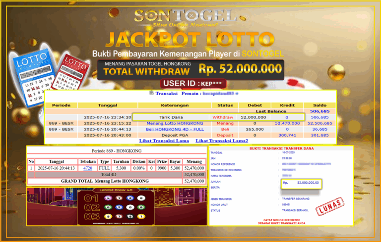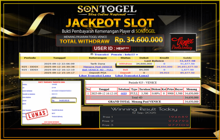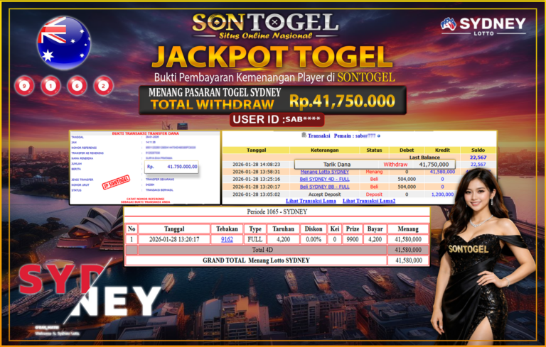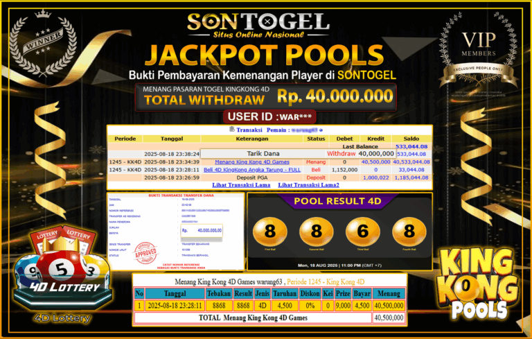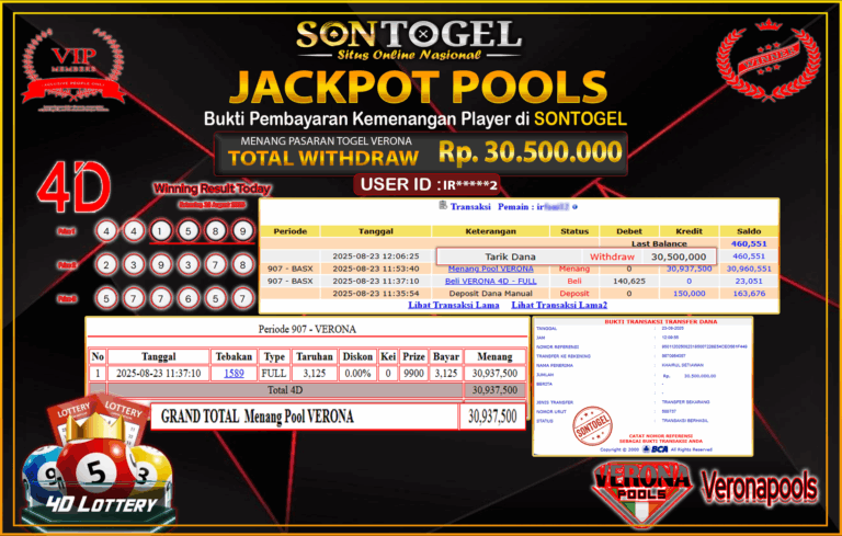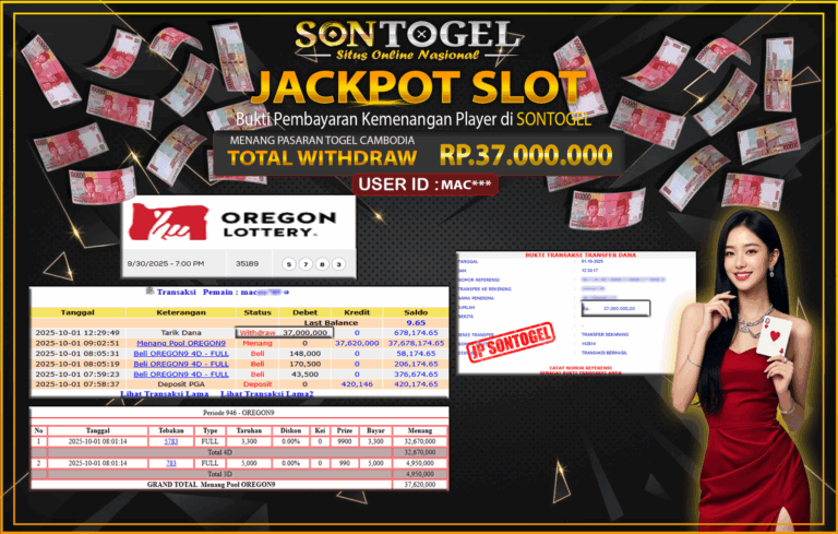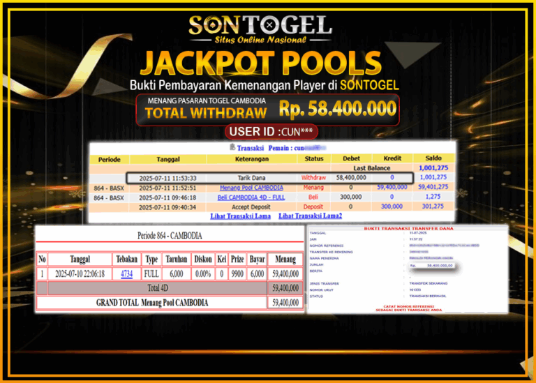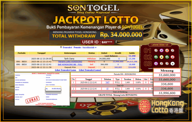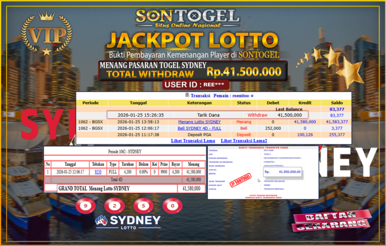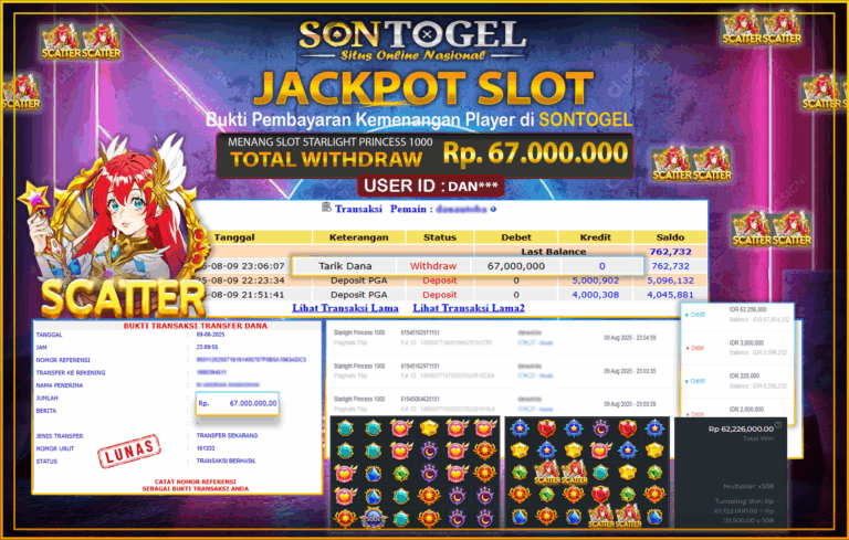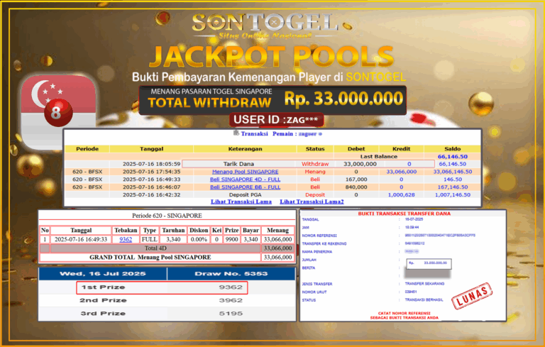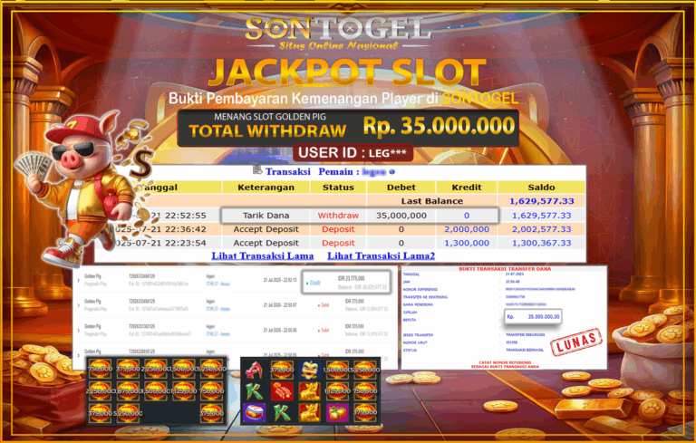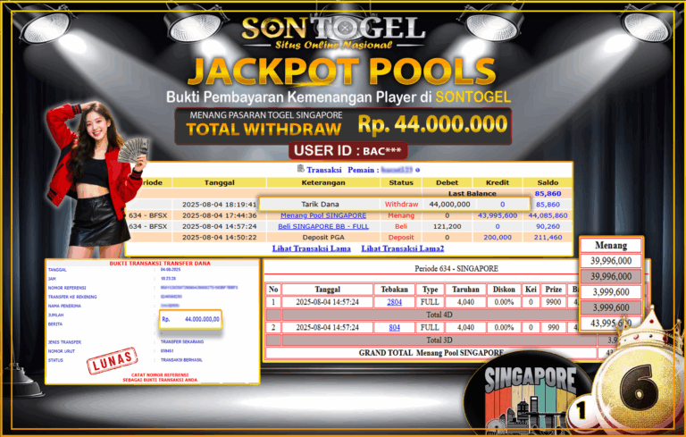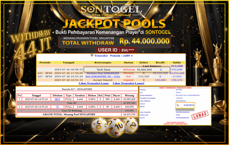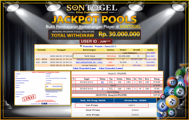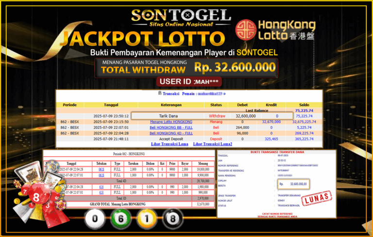 BUKTI JP SONTOGEL – Situs Togel Online, Live Casino dan Slot Online Terpercaya yang terbukti membayar berapapun kemenangan Anda tanpa kekurangan sepeserpun. Jika Anda masih mencari Situs Terpercaya, jangan ragu untuk bermain di SONTOGEL. Dalam 1 akun Anda bisa menikmati semua permainan dengan minimal deposit hanya Rp. 5.000,- saja. Berbagai pasaran togel resmi bisa Anda…