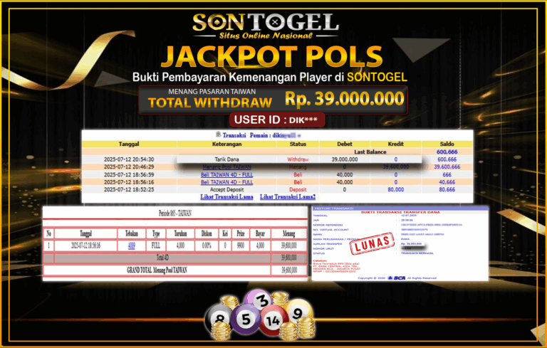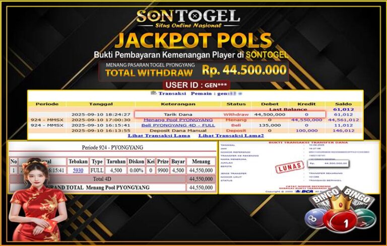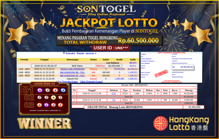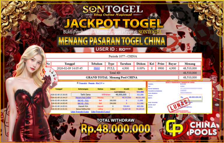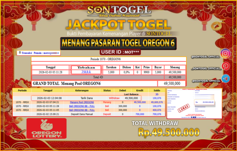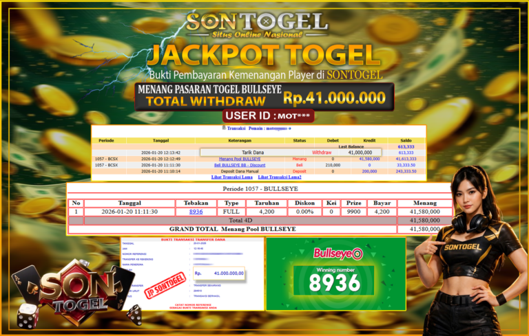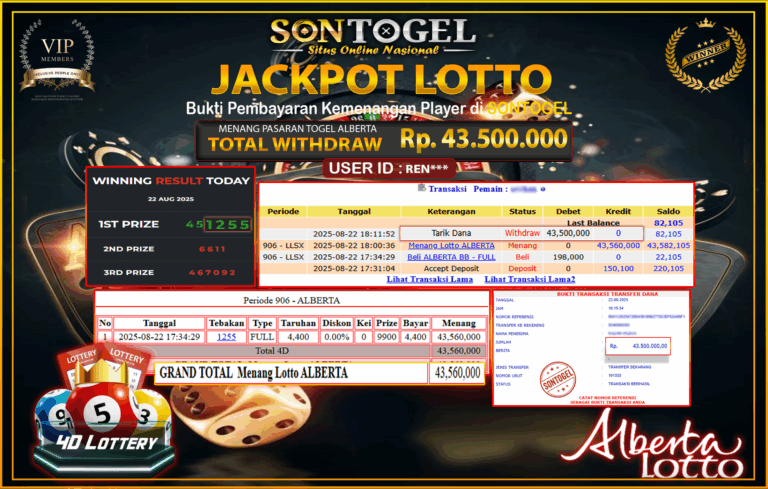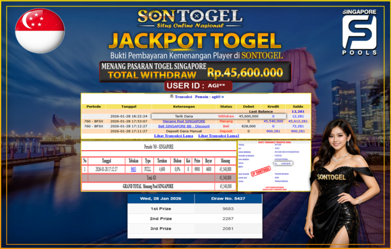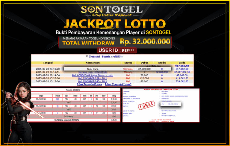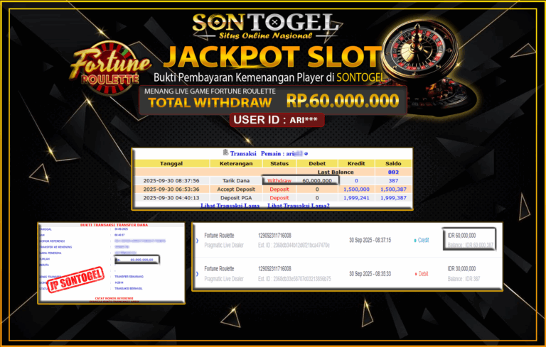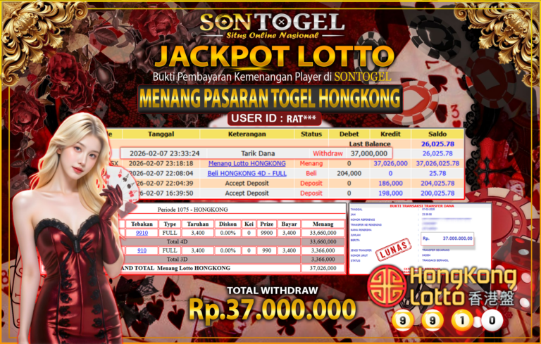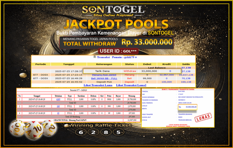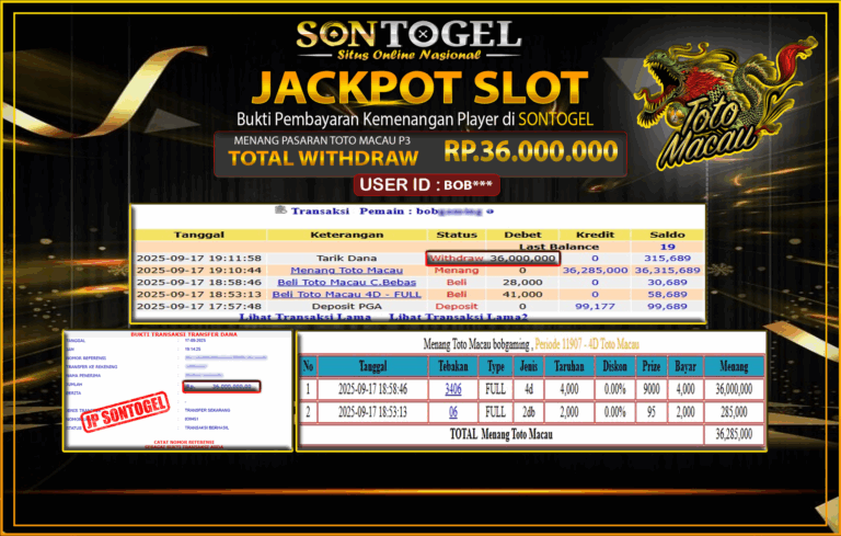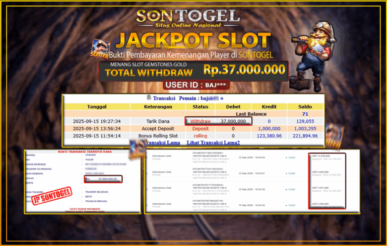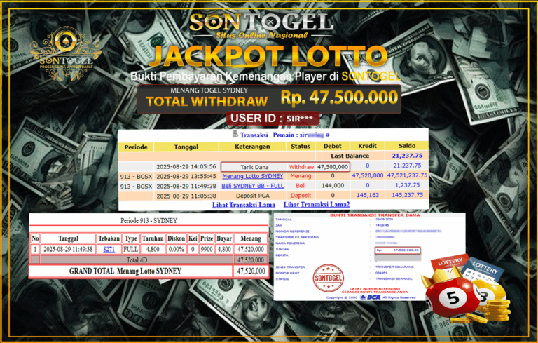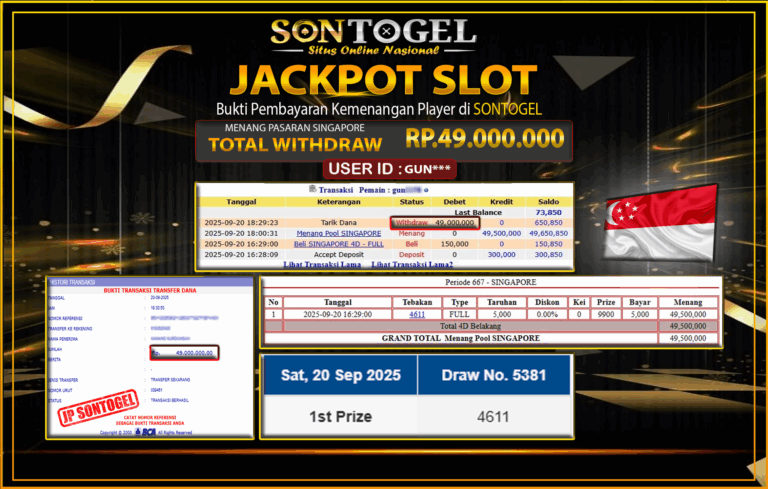 BUKTI JP SONTOGEL – Situs Togel Online, Live Casino dan Slot Online Terpercaya yang terbukti membayar berapapun kemenangan Anda tanpa kekurangan sepeserpun. Jika Anda masih mencari Situs Terpercaya, jangan ragu untuk bermain di SONTOGEL. Dalam 1 akun Anda bisa menikmati semua permainan dengan minimal deposit hanya Rp. 5.000,- saja. Berbagai pasaran togel resmi bisa Anda…