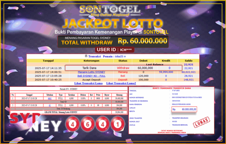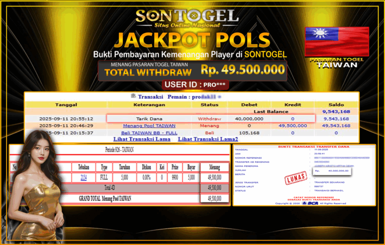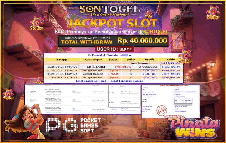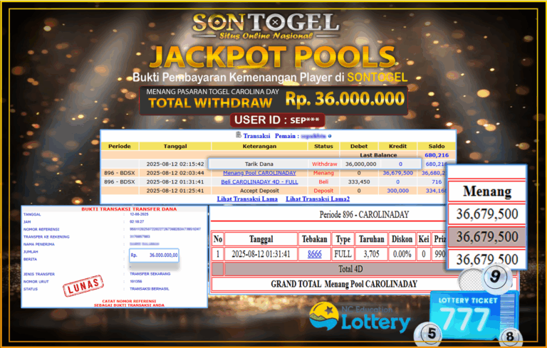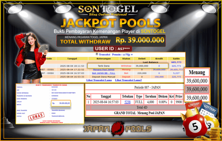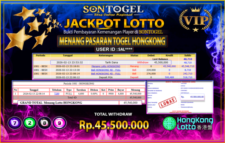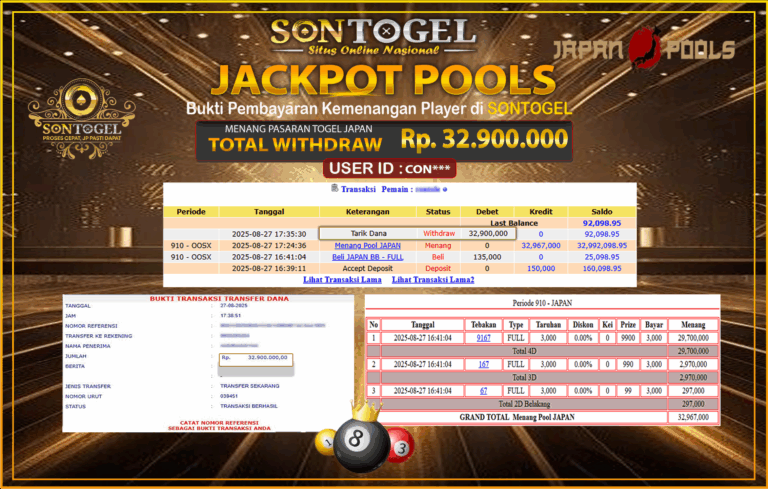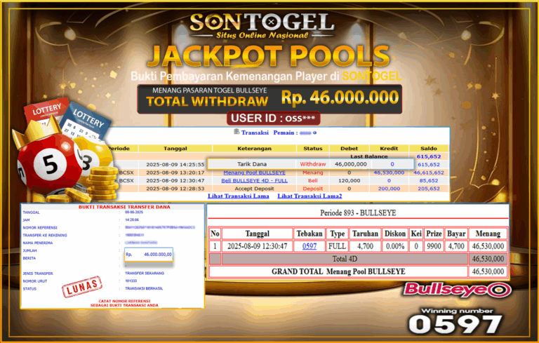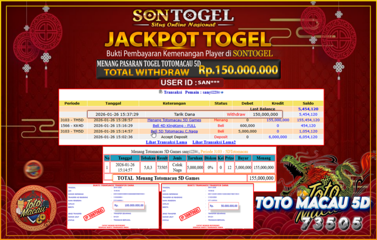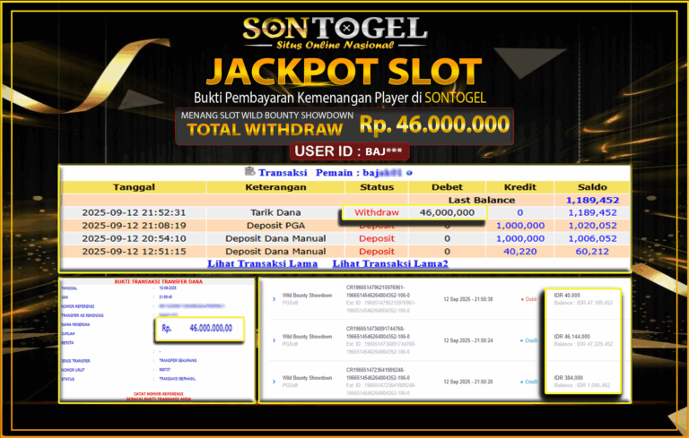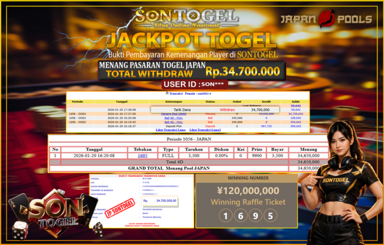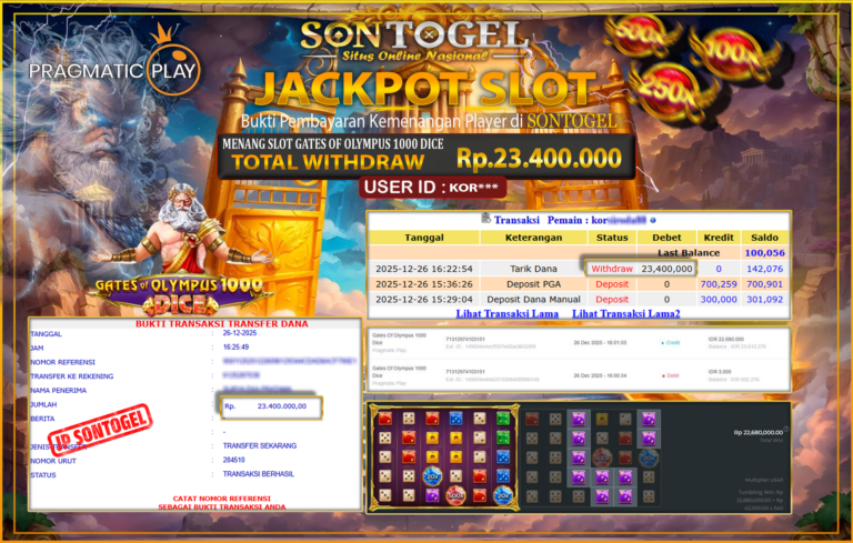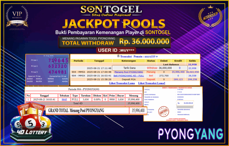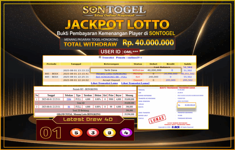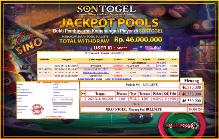 BUKTI JP SONTOGEL – Situs Togel Online, Live Casino dan Slot Online Terpercaya yang terbukti membayar berapapun kemenangan Anda tanpa kekurangan sepeserpun. Jika Anda masih mencari Situs Terpercaya, jangan ragu untuk bermain di SONTOGEL. Dalam 1 akun Anda bisa menikmati semua permainan dengan minimal deposit hanya Rp. 5.000,- saja. Berbagai pasaran togel resmi bisa Anda…