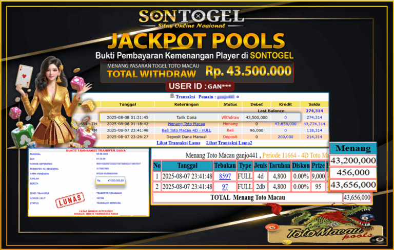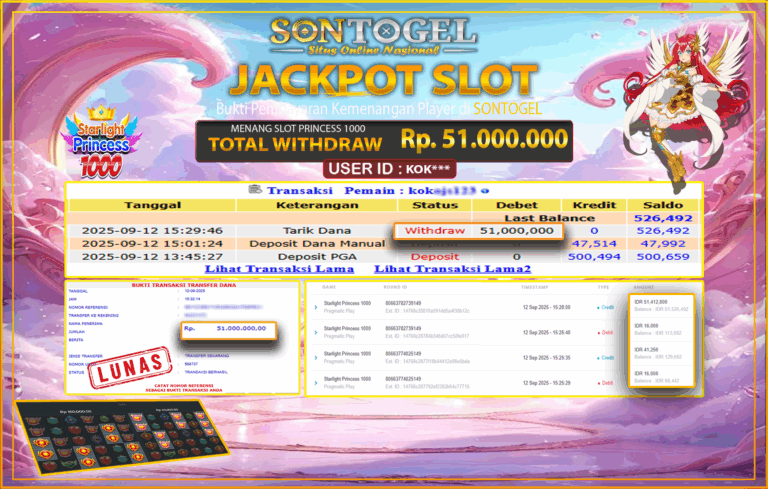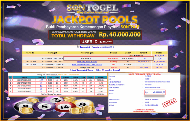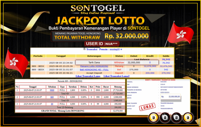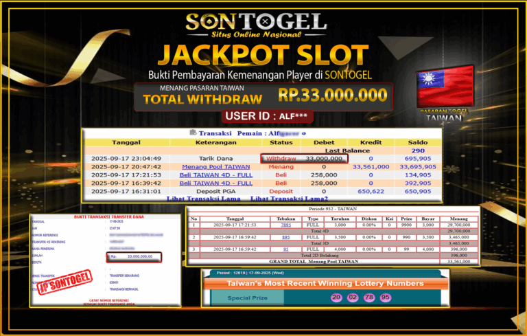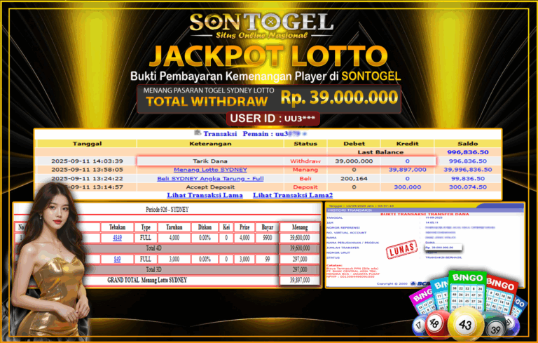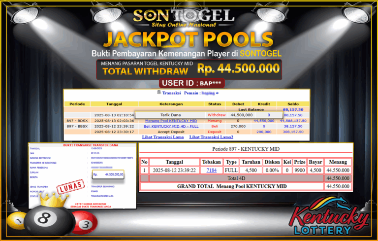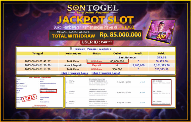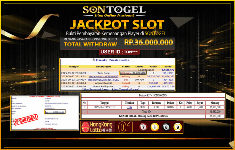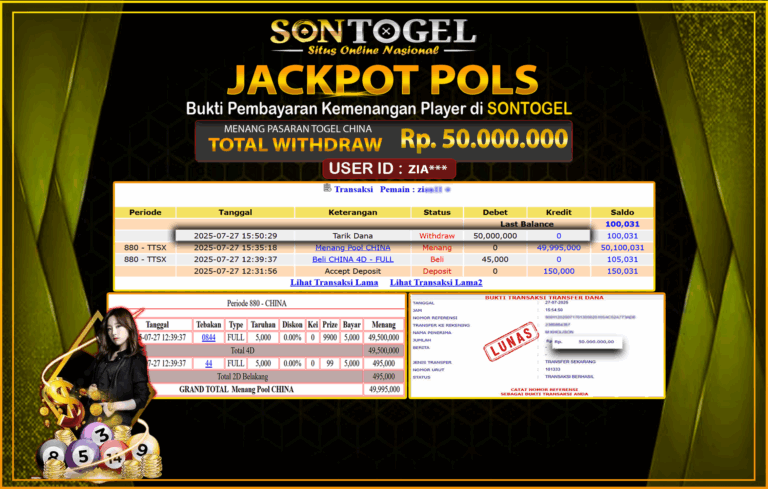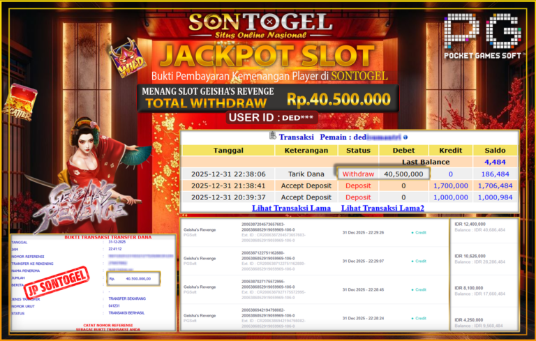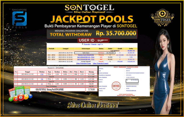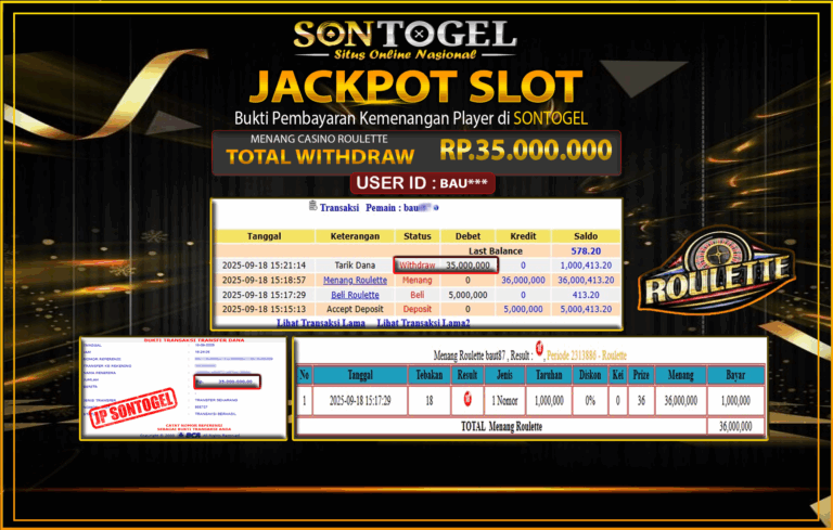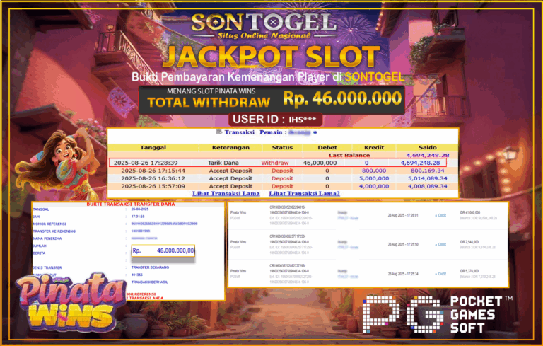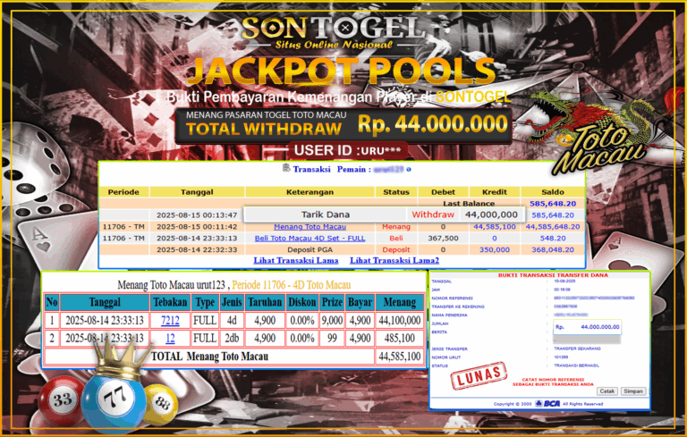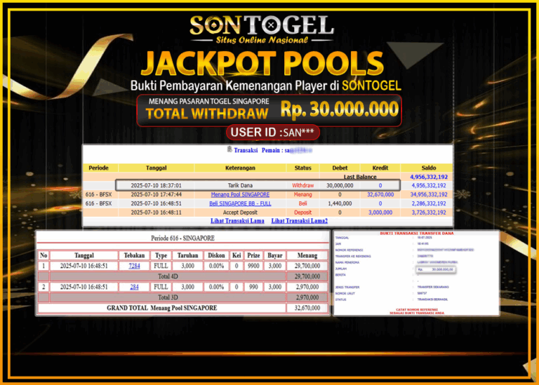 BUKTI JP SONTOGEL – Situs Togel Online, Live Casino dan Slot Online Terpercaya yang terbukti membayar berapapun kemenangan Anda tanpa kekurangan sepeserpun. Jika Anda masih mencari Situs Terpercaya, jangan ragu untuk bermain di SONTOGEL. Dalam 1 akun Anda bisa menikmati semua permainan dengan minimal deposit hanya Rp. 5.000,- saja. Berbagai pasaran togel resmi bisa Anda…