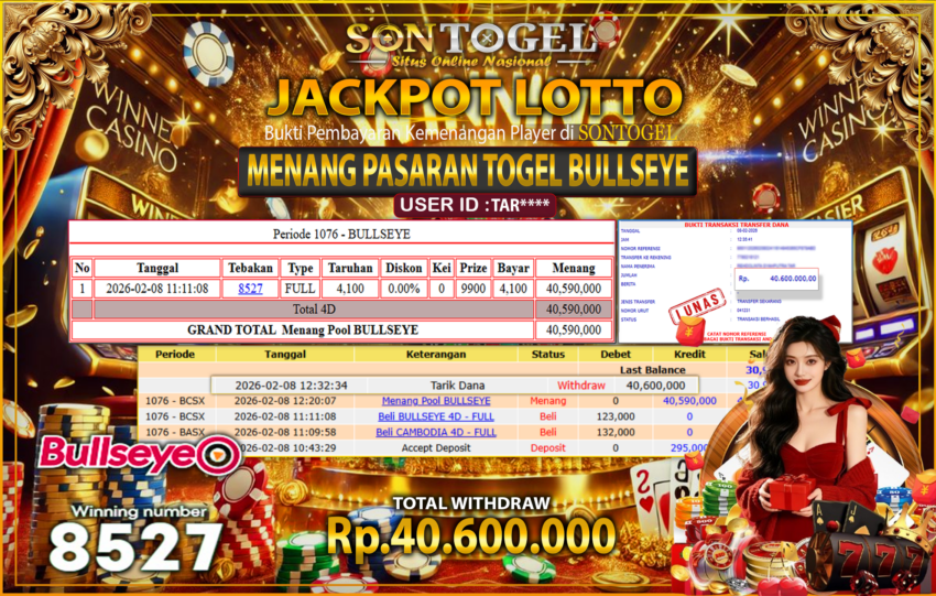 BUKTI JP SONTOGEL – Situs Togel Online, Live Casino dan Slot Online Terpercaya yang terbukti membayar berapapun kemenangan Anda tanpa kekurangan sepeserpun. Jika Anda masih mencari Situs Terpercaya,  jangan ragu untuk bermain di SONTOGEL. Dalam 1 akun Anda bisa menikmati semua permainan dengan minimal deposit hanya Rp. 5.000,- saja.