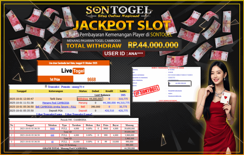 BUKTI JP SONTOGEL – Situs Togel Online, Live Casino dan Slot Online Terpercaya yang terbukti membayar berapapun kemenangan Anda tanpa kekurangan sepeserpun. Jika Anda masih mencari Situs Terpercaya, jangan ragu untuk bermain di SONTOGEL. Dalam 1 akun Anda bisa menikmati semua permainan dengan minimal deposit hanya Rp. 5.000,- saja.