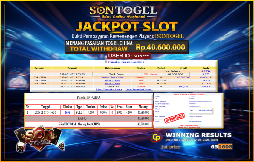 BUKTI JP SONTOGEL – Situs Togel Online, Live Casino dan Slot Online Terpercaya yang terbukti membayar berapapun kemenangan Anda tanpa kekurangan sepeserpun. Jika Anda masih mencari Situs Terpercaya, jangan ragu untuk bermain di SONTOGEL. Dalam 1 akun Anda bisa menikmati semua permainan dengan minimal deposit hanya Rp. 5.000,- saja.