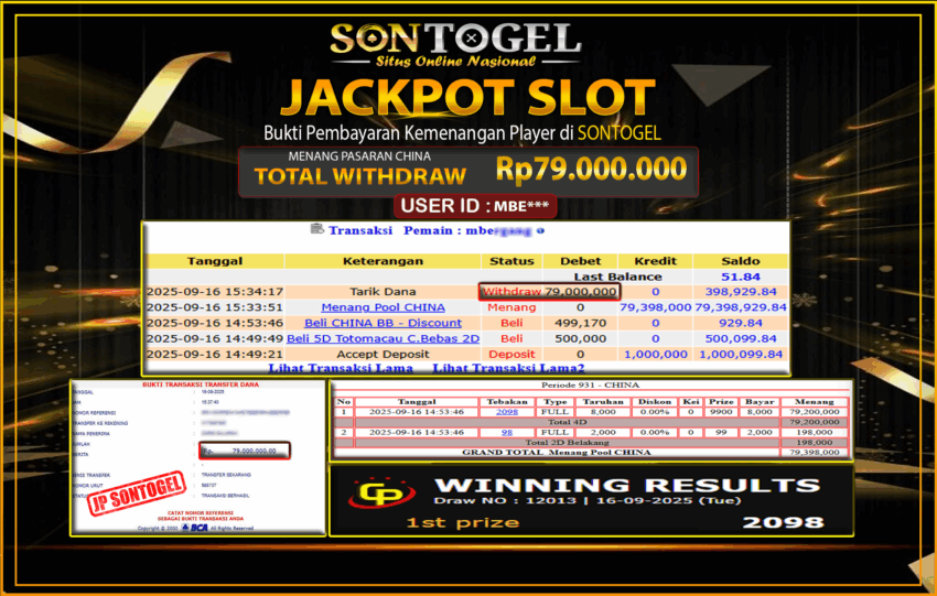 Berikut ini adalah BUKTI JP SONTOGEL yang sudah diproseskan ke rekening member kami