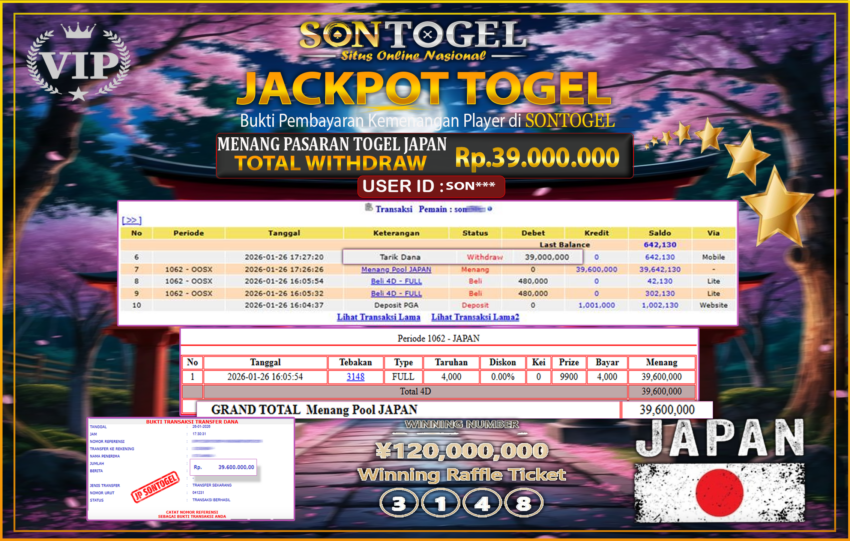 Selamat Kepada Member SONTOGEL dengan USER ID : SON*** JP PASARAN JAPAN Rp.39.000.000,- LUNAS langsung di transfer ke rekening member tanpa kurang sepeserpun. Terimakasih telah mempercayakan SONTOGEL sebagai Situs Online Terpercaya dan Aman! Jangan tunggu tunggu lagi! langsung saja daftarkan akun bermain di SONTOGEL dan dapatkan bonus berlimpah setiap minggunya.