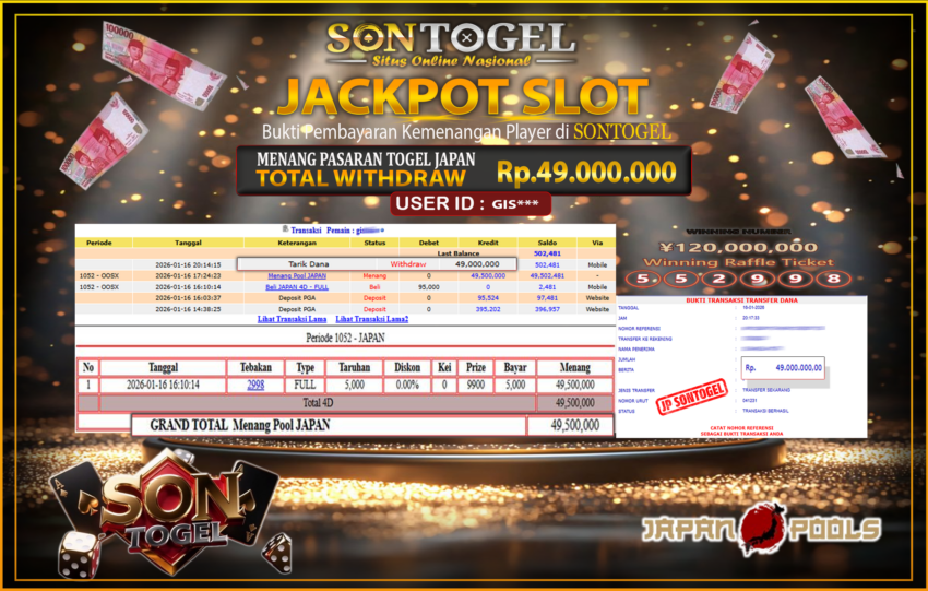 BUKTI JP SONTOGEL – Situs Togel Online, Live Casino dan Slot Online Terpercaya yang terbukti membayar berapapun kemenangan Anda tanpa kekurangan sepeserpun. Jika Anda masih mencari Situs Terpercaya, jangan ragu untuk bermain di SONTOGEL. Dalam 1 akun Anda bisa menikmati semua permainan dengan minimal deposit hanya Rp. 5.000,- saja.
