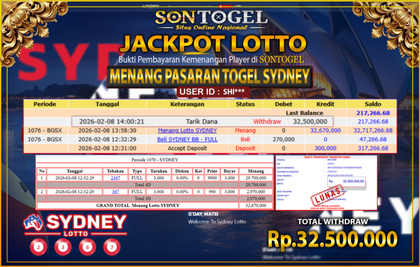 Selamat Kepada Member SONTOGEL dengan USER ID : SHI*** JP PASARAN SYDNEY Rp.32.500.000,- LUNAS langsung di transfer ke rekening member tanpa kurang sepeserpun. Terimakasih telah mempercayakan SONTOGEL sebagai Situs Online Terpercaya dan Aman! Jangan tunggu tunggu lagi! langsung saja daftarkan akun bermain di SONTOGEL dan dapatkan bonus berlimpah setiap minggunya.