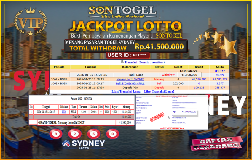 BUKTI JP SONTOGEL – Situs Togel Online, Live Casino dan Slot Online Terpercaya yang terbukti membayar berapapun kemenangan Anda tanpa kekurangan sepeserpun. Jika Anda masih mencari Situs Terpercaya, jangan ragu untuk bermain di SONTOGEL. Dalam 1 akun Anda bisa menikmati semua permainan dengan minimal deposit hanya Rp. 5.000,- saja.