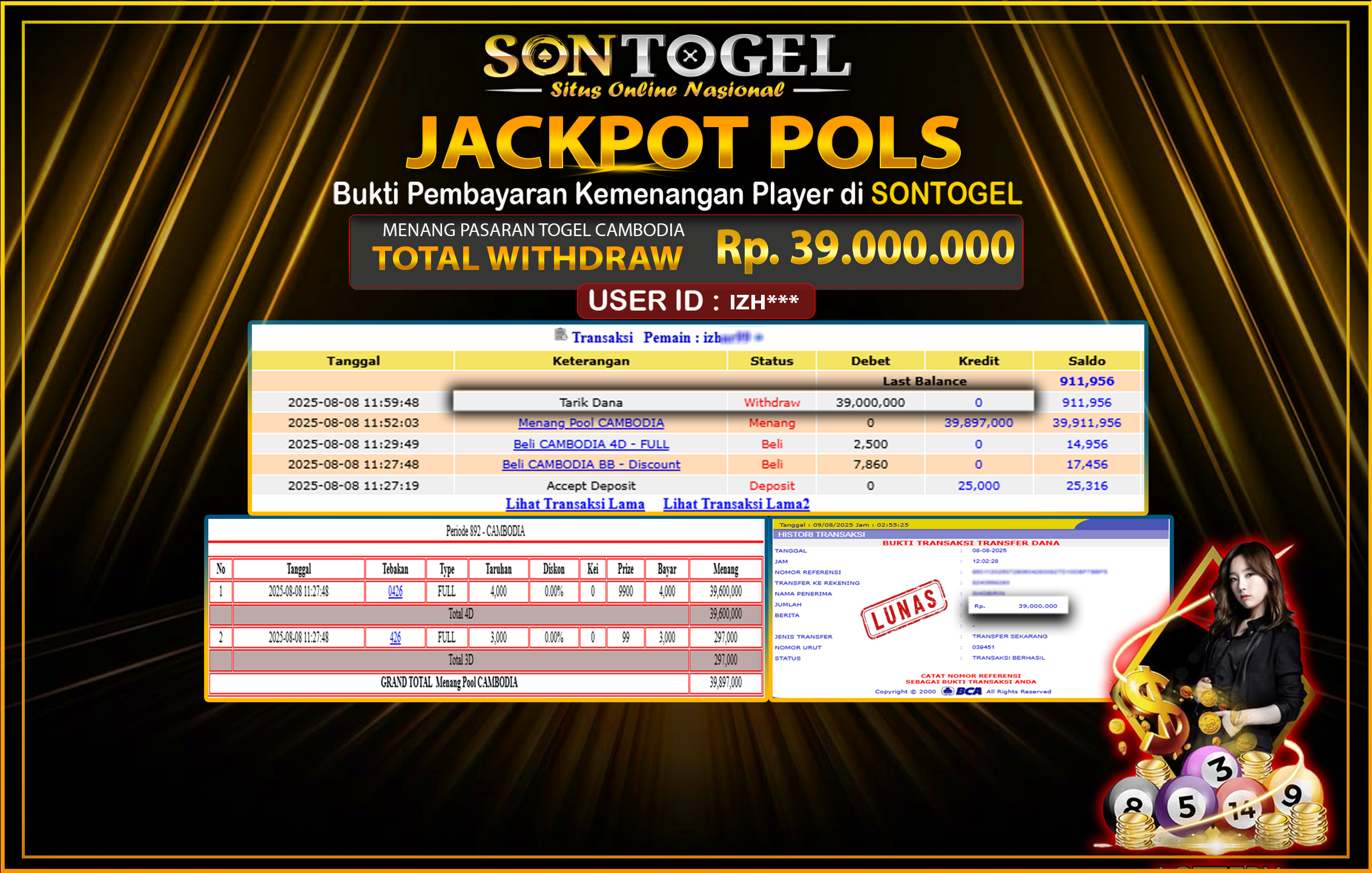 Selamat Kepada Member SONTOGEL dengan USER ID :IZH*** PASARAN TOGEL CAMBODIA sebesar RP.39.000.000,- LUNAS langsung di transfer ke rekening member tanpa kurang sepeserpun. Terimakasih telah mempercayakan SONTOGEL sebagai Situs Online Terpercaya dan Aman! Jangan tunggu tunggu lagi! langsung saja daftarkan akun bermain di SONTOGEL dan dapatkan bonus berlimpah setiap minggunya.
