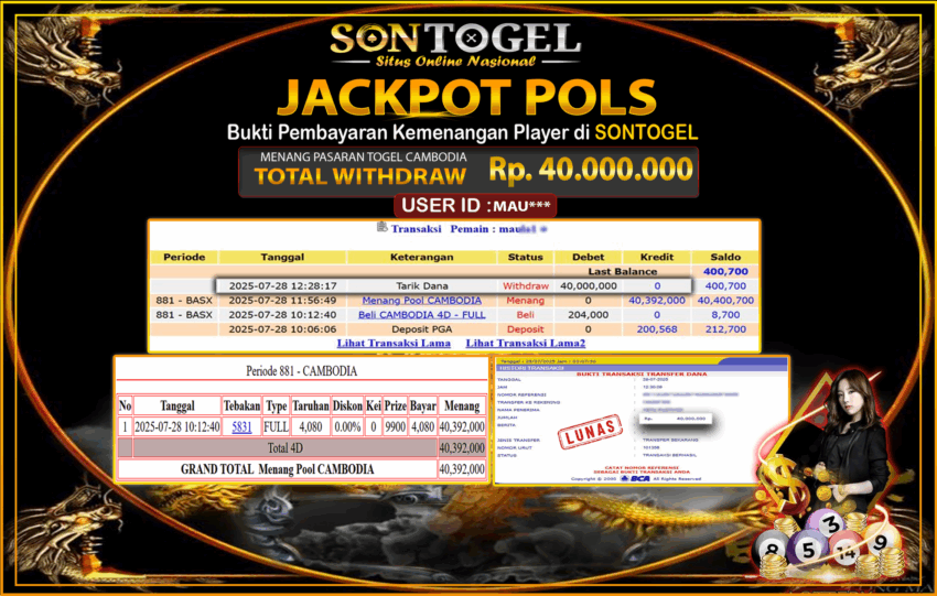 Selamat Kepada Member SONTOGEL dengan USER ID :MAU*** PASARAN TOGEL CAMBODIA sebesar RP.40.000.000,- LUNAS langsung di transfer ke rekening member tanpa kurang sepeserpun. Terimakasih telah mempercayakan SONTOGEL sebagai Situs Online Terpercaya dan Aman! Jangan tunggu tunggu lagi! langsung saja daftarkan akun bermain di SONTOGEL dan dapatkan bonus berlimpah setiap minggunya.