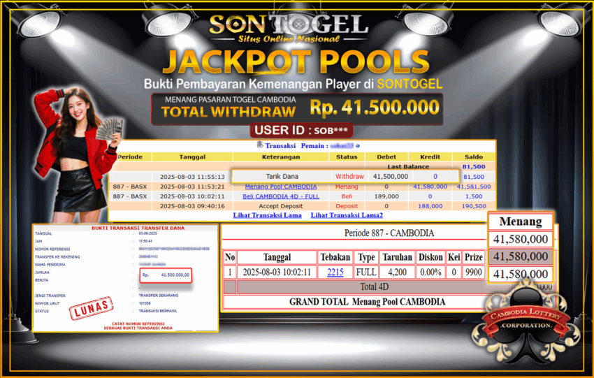 BUKTI JP SONTOGEL – Situs Togel Online, Live Casino dan Slot Online Terpercaya yang terbukti membayar berapapun kemenangan Anda tanpa kekurangan sepeserpun. Jika Anda masih mencari Situs Terpercaya, jangan ragu untuk bermain di SONTOGEL. Dalam 1 akun Anda bisa menikmati semua permainan dengan minimal deposit hanya Rp. 5.000,- saja.