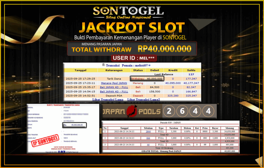 BUKTI JP SONTOGEL – Situs Togel Online, Live Casino dan Slot Online Terpercaya yang terbukti membayar berapapun kemenangan Anda tanpa kekurangan sepeserpun. Jika Anda masih mencari Situs Terpercaya, jangan ragu untuk bermain di SONTOGEL. Dalam 1 akun Anda bisa menikmati semua permainan dengan minimal deposit hanya Rp. 5.000,- saja.