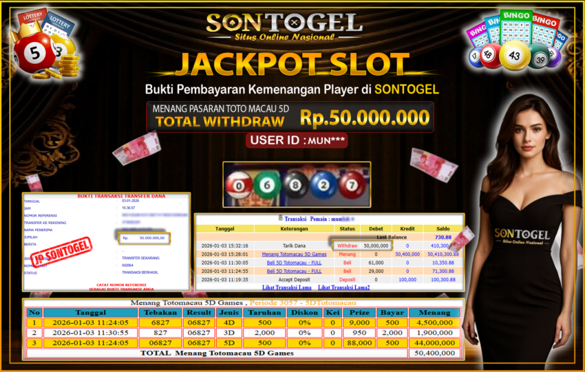 BUKTI JP SONTOGEL – Situs Togel Online, Live Casino dan Slot Online Terpercaya yang terbukti membayar berapapun kemenangan Anda tanpa kekurangan sepeserpun. Jika Anda masih mencari Situs Terpercaya, jangan ragu untuk bermain di SONTOGEL. Dalam 1 akun Anda bisa menikmati semua permainan dengan minimal deposit hanya Rp. 5.000,- saja.