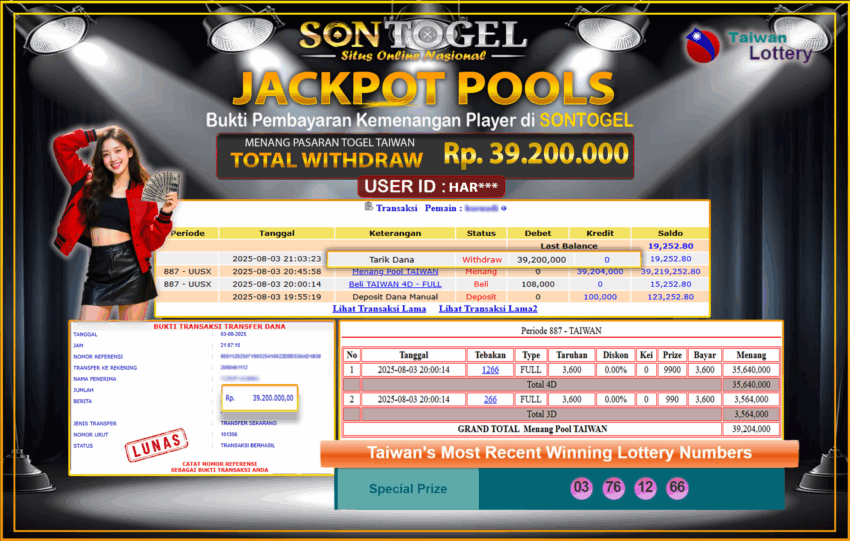 BUKTI JP SONTOGEL – Situs Togel Online, Live Casino dan Slot Online Terpercaya yang terbukti membayar berapapun kemenangan Anda tanpa kekurangan sepeserpun. Jika Anda masih mencari Situs Terpercaya, jangan ragu untuk bermain di SONTOGEL. Dalam 1 akun Anda bisa menikmati semua permainan dengan minimal deposit hanya Rp. 5.000,- saja.