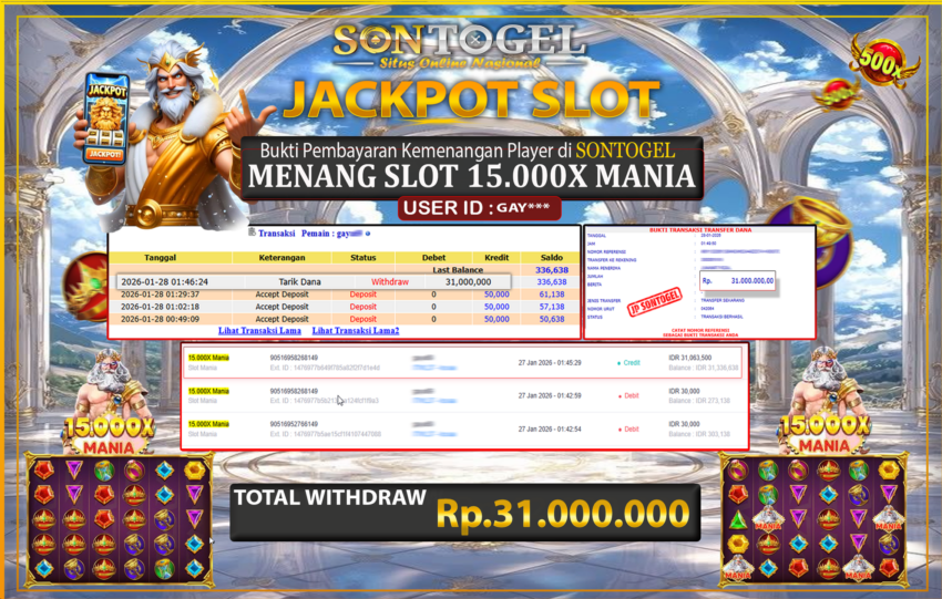 BUKTI JP SONTOGEL – Situs Togel Online, Live Casino dan Slot Online Terpercaya yang terbukti membayar berapapun kemenangan Anda tanpa kekurangan sepeserpun. Jika Anda masih mencari Situs Terpercaya, jangan ragu untuk bermain di SONTOGEL. Dalam 1 akun Anda bisa menikmati semua permainan dengan minimal deposit hanya Rp. 5.000,- saja.