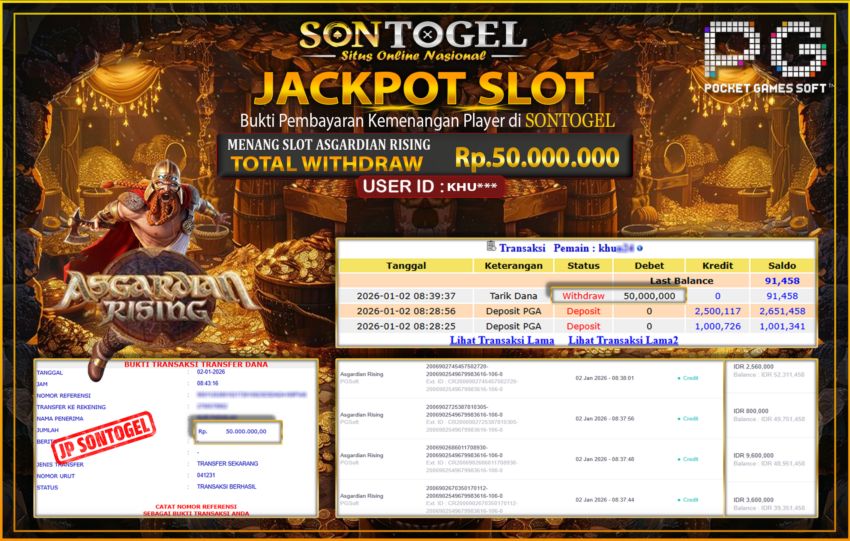 Selamat Kepada Member SONTOGEL dengan USER ID : KHU*** SLOT ASGARDIAN RISING di provider PG Soft sebesar RP.50.000.000,- LUNAS langsung di transfer ke rekening member tanpa kurang sepeserpun. Terimakasih telah mempercayakan SONTOGEL sebagai Situs Online Terpercaya dan Aman! Jangan tunggu tunggu lagi! langsung saja daftarkan akun bermain di SONTOGEL dan dapatkan bonus berlimpah setiap minggunya.