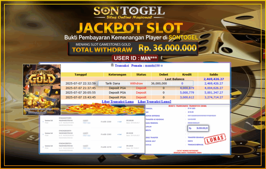 Selamat Kepada Member SONTOGEL dengan USER ID : MAN*** SLOT GAMESTONES GOLD di provider PG Soft sebesar RP.36.000.000,- LUNAS langsung di  transfer ke rekening member tanpa kurang sepeserpun. Terimakasih telah mempercayakan SONTOGEL sebagai Situs Online Terpercaya dan Aman! Jangan tunggu tunggu lagi! langsung saja daftarkan akun bermain di SONTOGEL dan dapatkan bonus berlimpah setiap minggunya.