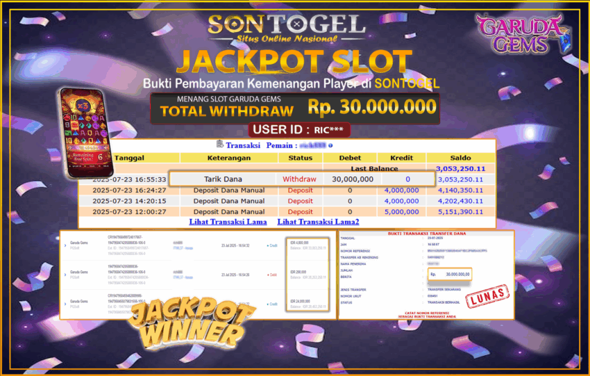 Selamat Kepada Member SONTOGEL dengan USER ID : RIC*** SLOT GARUDA GEMS di provider PG Soft sebesar RP.30.000.000,- LUNAS langsung di transfer ke rekening member tanpa kurang sepeserpun. Terimakasih telah mempercayakan SONTOGEL sebagai Situs Online Terpercaya dan Aman! Jangan tunggu tunggu lagi! langsung saja daftarkan akun bermain di SONTOGEL dan dapatkan bonus berlimpah setiap minggunya.