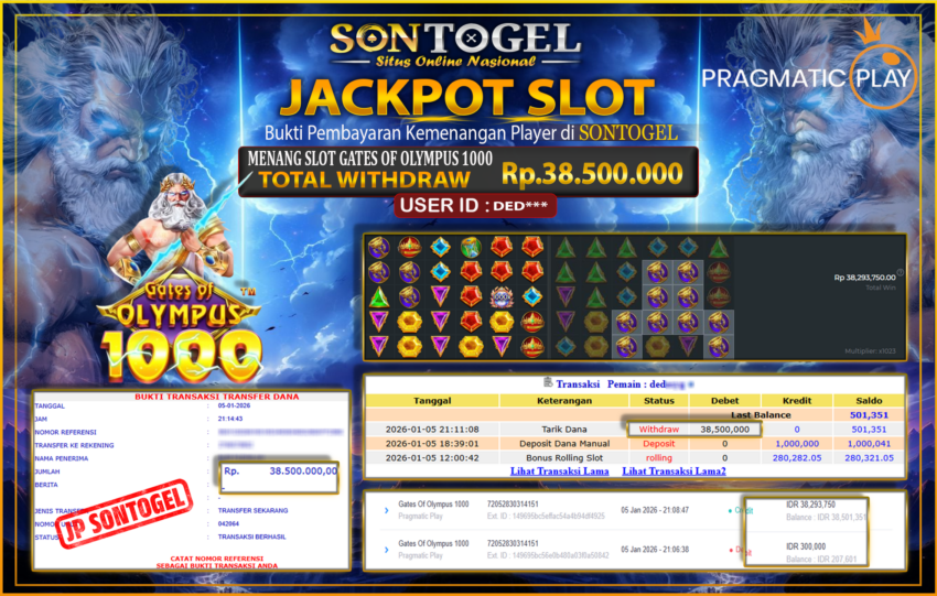 Selamat Kepada Member SONTOGEL dengan USER ID : DED*** SLOT SLOT GATES OF OLYMPUS 1000 di Pragmatic Play sebesar RP.38.500.000,- LUNAS langsung di transfer ke rekening member tanpa kurang sepeserpun. Terimakasih telah mempercayakan SONTOGEL sebagai Situs Online Terpercaya dan Aman! Jangan tunggu tunggu lagi! langsung saja daftarkan akun bermain di SONTOGEL dan dapatkan bonus berlimpah setiap minggunya.