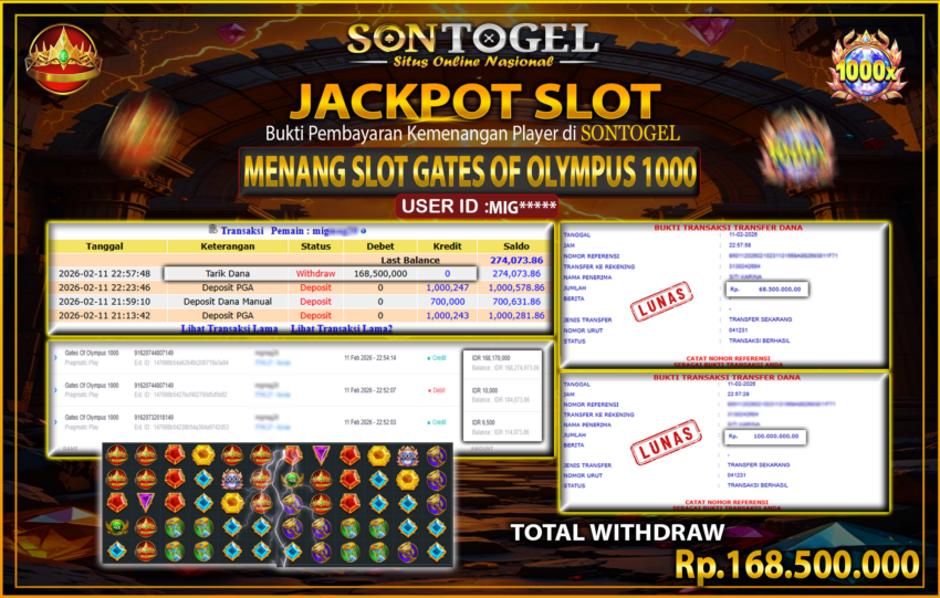 Selamat Kepada Member SONTOGEL dengan USER ID :MIG****** SLOT GATES OF OLYMPUS 1000 BUKTI JP SONTOGEL – Situs Togel Online, Live Casino dan Slot Online Terpercaya yang terbukti membayar berapapun kemenangan Anda tanpa kekurangan sepeserpun. Jika Anda masih mencari Situs Terpercaya, jangan ragu untuk bermain di SONTOGEL. Dalam 1 akun Anda bisa menikmati semua permainan dengan minimal deposit hanya Rp. 5.000,- saja.