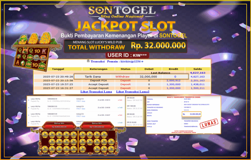 Selamat Kepada Member SONTOGEL dengan USER ID : KIW*** SLOT LUCKY’S WILD PUB di provider Pragmatic Play sebesar RP.32.000.000,- LUNAS langsung di  transfer ke rekening member tanpa kurang sepeserpun. Terimakasih telah mempercayakan SONTOGEL sebagai Situs Online Terpercaya dan Aman! Jangan tunggu tunggu lagi! langsung saja daftarkan akun bermain di SONTOGEL dan dapatkan bonus berlimpah setiap minggunya.