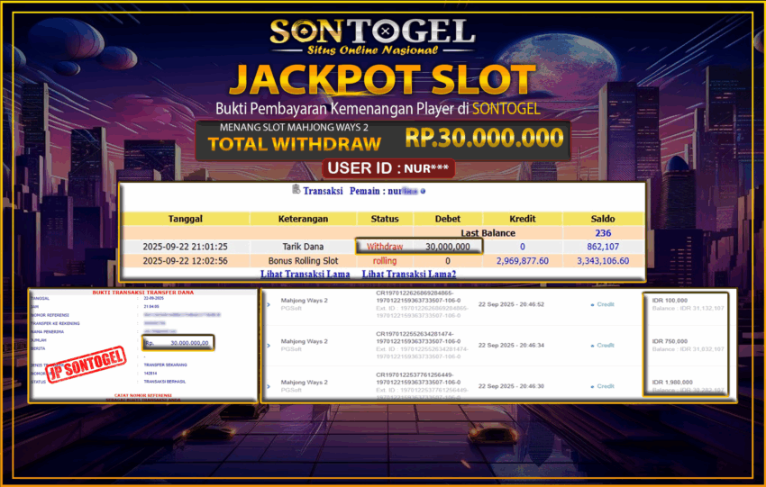Berikut ini adalah BUKTI JP SONTOGEL yang sudah diproseskan ke rekening member kami