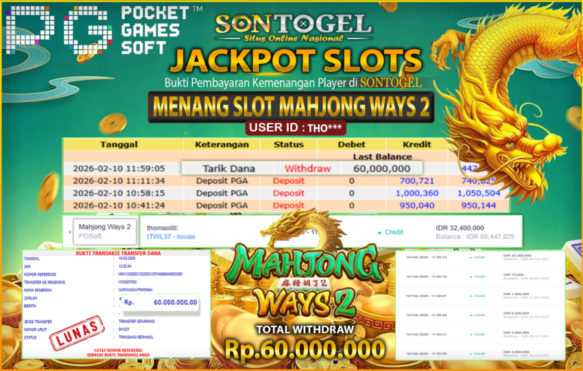 Selamat Kepada Member SONTOGEL dengan USER ID : THO*** SLOT MAHJONG WAYS 2 di PG SOFT sebesar RP.60.000.000,- LUNAS langsung di transfer ke rekening member tanpa kurang sepeserpun. Terimakasih telah mempercayakan SONTOGEL sebagai Situs Online Terpercaya dan Aman! Jangan tunggu tunggu lagi! langsung saja daftarkan akun bermain di SONTOGEL dan dapatkan bonus berlimpah setiap minggunya.