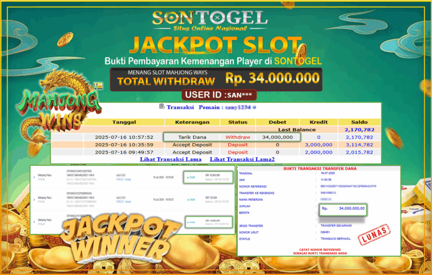 Selamat Kepada Member SONTOGEL dengan USER ID : SAN*** SLOT MAHJONG WAYS di provider PG Soft sebesar RP.34.000.000,- LUNAS langsung di transfer ke rekening member tanpa kurang sepeserpun. Terimakasih telah mempercayakan SONTOGEL sebagai Situs Online Terpercaya dan Aman! Jangan tunggu tunggu lagi! langsung saja daftarkan akun bermain di SONTOGEL dan dapatkan bonus berlimpah setiap minggunya.