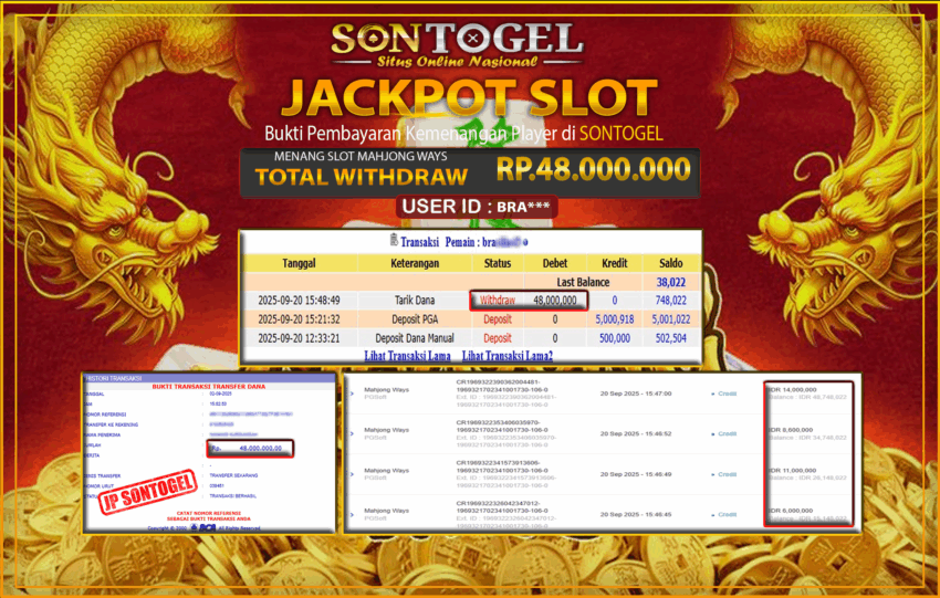 Selamat Kepada Member SONTOGEL dengan USER ID : BRA*** SLOT MAHJONG WAYS di provider PG Soft sebesar RP.48.000.000,- LUNAS langsung di transfer ke rekening member tanpa kurang sepeserpun. Terimakasih telah mempercayakan SONTOGEL sebagai Situs Online Terpercaya dan Aman! Jangan tunggu tunggu lagi! langsung saja daftarkan akun bermain di SONTOGEL dan dapatkan bonus berlimpah setiap minggunya.