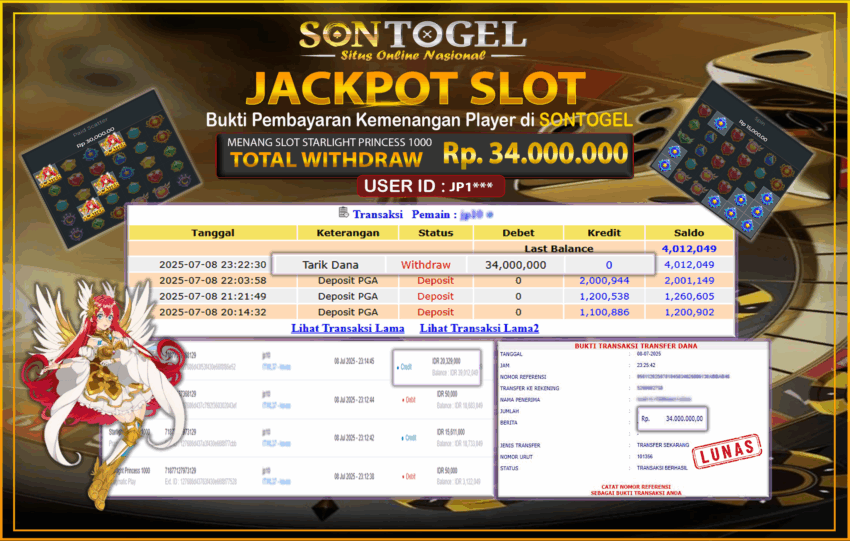 BUKTI JP SONTOGEL – Situs Togel Online, Live Casino dan Slot Online Terpercaya yang terbukti membayar berapapun kemenangan Anda tanpa kekurangan sepeserpun. Jika Anda masih mencari Situs Terpercaya, jangan ragu untuk bermain di SONTOGEL. Dalam 1 akun Anda bisa menikmati semua permainan dengan minimal deposit hanya Rp. 5.000,- saja.