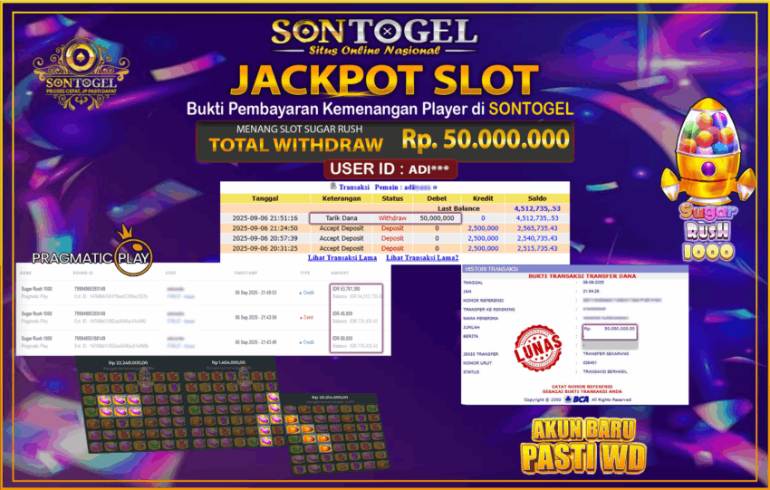 Selamat Kepada Member SONTOGEL dengan USER ID : ADI*** SLOT SUGAR RUSH di PRAGMATIC sebesar RP.50.000.000,- LUNAS langsung di transfer ke rekening member tanpa kurang sepeserpun. Terimakasih telah mempercayakan SONTOGEL sebagai Situs Online Terpercaya dan Aman! Jangan tunggu tunggu lagi! langsung saja daftarkan akun bermain di SONTOGEL dan dapatkan bonus berlimpah setiap minggunya.