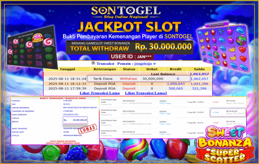 JP SONTOGEL SLOT SWEET BONANZA Rp.30.000.000