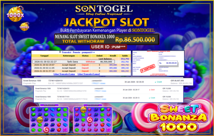 Selamat Kepada Member SONTOGEL dengan USER ID : PUM*** SLOT SWEET BONANZA BUKTI JP SONTOGEL – Situs Togel Online, Live Casino dan Slot Online Terpercaya yang terbukti membayar berapapun kemenangan Anda tanpa kekurangan sepeserpun. Jika Anda masih mencari Situs Terpercaya, jangan ragu untuk bermain di SONTOGEL. Dalam 1 akun Anda bisa menikmati semua permainan dengan minimal deposit hanya Rp. 5.000,- saja.