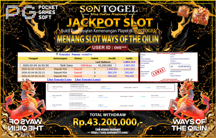 Selamat Kepada Member SONTOGEL dengan USER ID :OVE*** SLOT WAYS OF THE QILIN 2 BUKTI JP SONTOGEL – Situs Togel Online, Live Casino dan Slot Online Terpercaya yang terbukti membayar berapapun kemenangan Anda tanpa kekurangan sepeserpun. Jika Anda masih mencari Situs Terpercaya,  jangan ragu untuk bermain di SONTOGEL. Dalam 1 akun Anda bisa menikmati semua permainan dengan minimal deposit hanya Rp. 5.000,- saja.