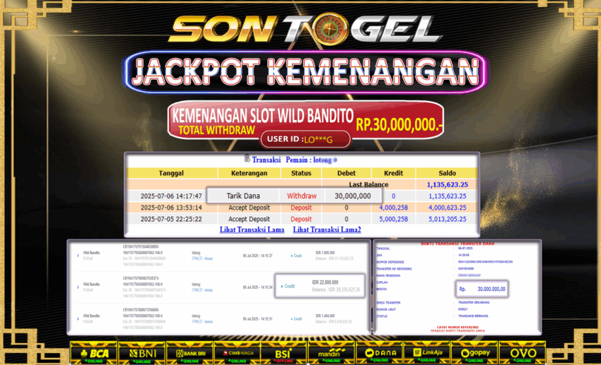Selamat Kepada Member SONTOGEL dengan USER ID : LOT*** SLOT WILD BANDITO di provider PG Soft sebesar RP.32.000.000,- LUNAS langsung di transfer ke rekening member tanpa kurang sepeserpun. Terimakasih telah mempercayakan SONTOGEL sebagai Situs Online Terpercaya dan Aman! Jangan tunggu tunggu lagi! langsung saja daftarkan akun bermain di SONTOGEL dan dapatkan bonus berlimpah setiap minggunya.