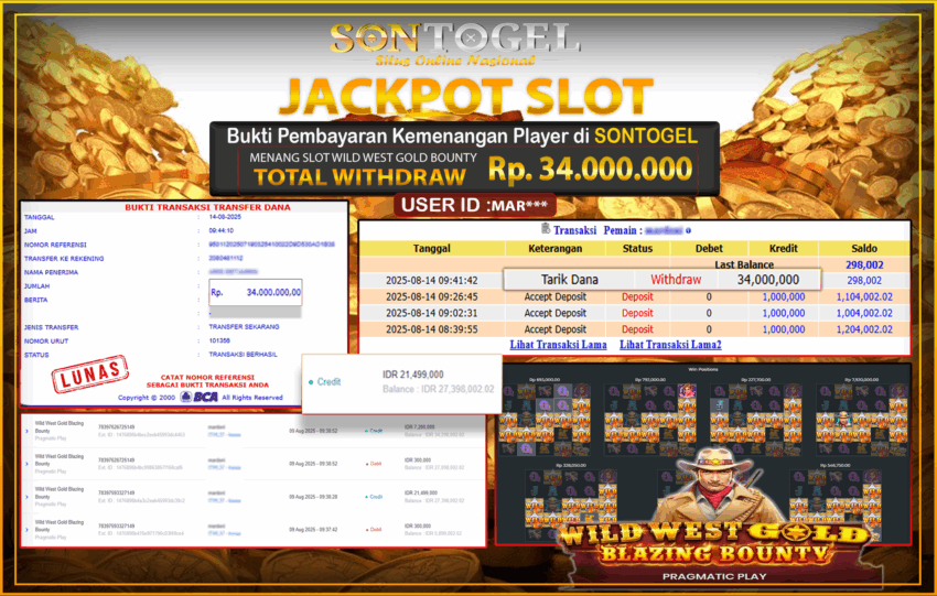 Selamat Kepada Member SONTOGEL dengan USER ID : MAR*** SLOT WILD WEST GOLD BLAZING BOUNTY di Pragmatic Play Play sebesar RP.34.000.000,- LUNAS langsung di transfer ke rekening member tanpa kurang sepeserpun. Terimakasih telah mempercayakan SONTOGEL sebagai Situs Online Terpercaya dan Aman! Jangan tunggu tunggu lagi! langsung saja daftarkan akun bermain di SONTOGEL dan dapatkan bonus berlimpah setiap minggunya.