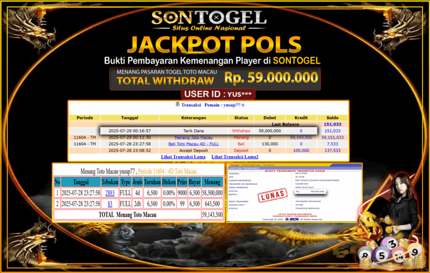 BUKTI JP SONTOGEL – Situs Togel Online, Live Casino dan Slot Online Terpercaya yang terbukti membayar berapapun kemenangan Anda tanpa kekurangan sepeserpun. Jika Anda masih mencari Situs Terpercaya, jangan ragu untuk bermain di SONTOGEL. Dalam 1 akun Anda bisa menikmati semua permainan dengan minimal deposit hanya Rp. 5.000,- saja.