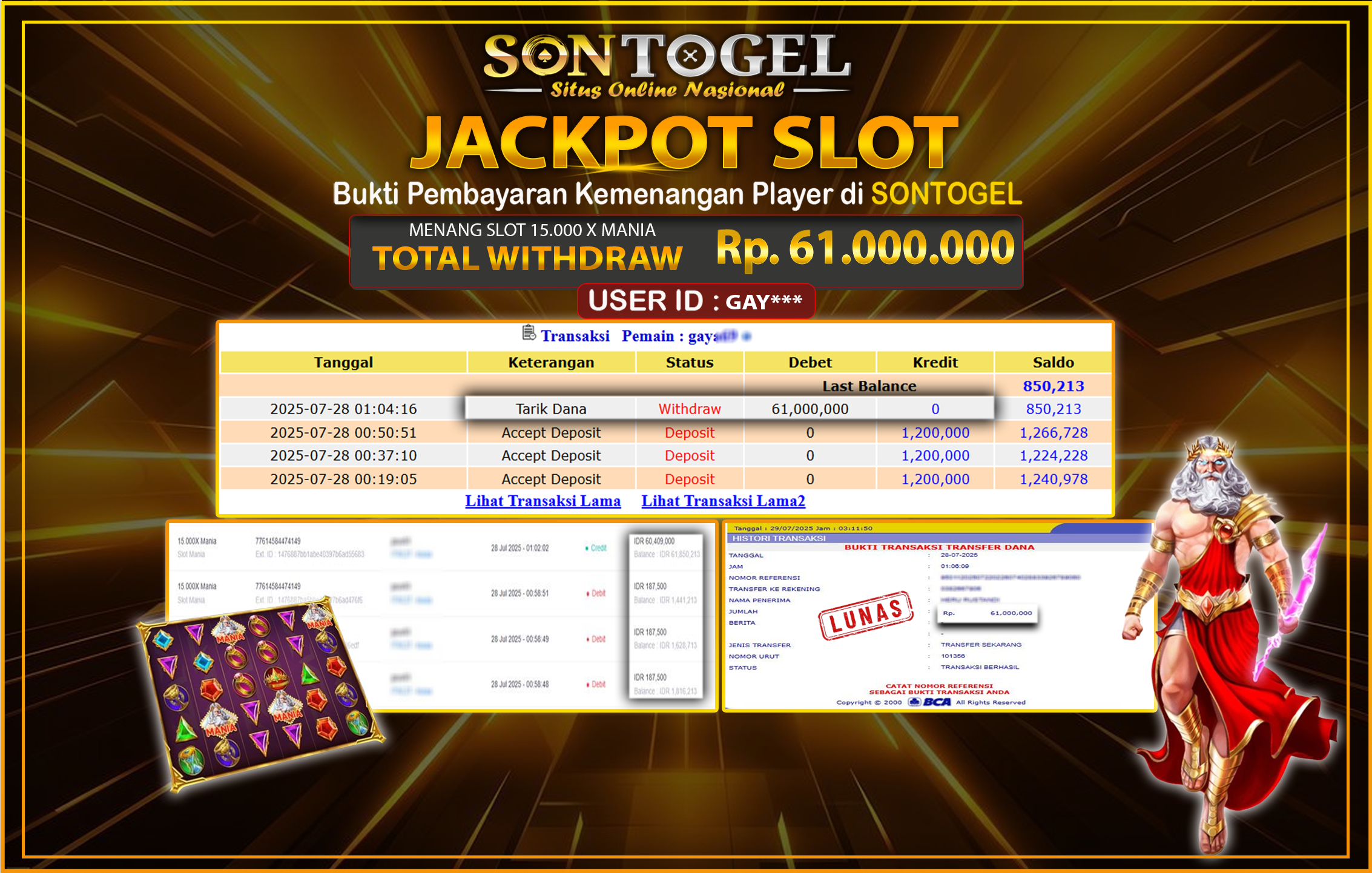 Berikut ini adalah BUKTI JP SONTOGEL yang sudah diproseskan ke rekening member kami