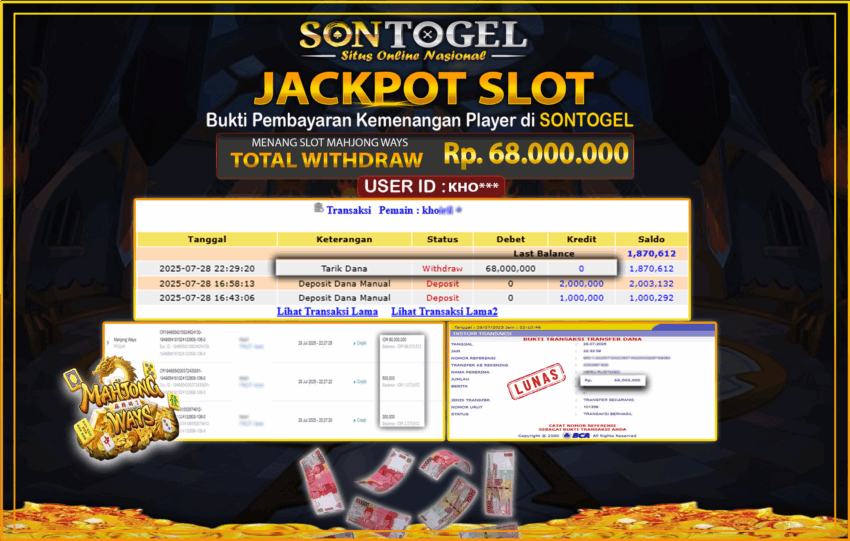 Selamat Kepada Member SONTOGEL dengan USER ID :KHO*** SLOT MAHJONG WAYS di provider Pragmatic Play sebesar RP.68.000.000,- LUNAS langsung di transfer ke rekening member tanpa kurang sepeserpun. Terimakasih telah mempercayakan SONTOGEL sebagai Situs Online Terpercaya dan Aman! Jangan tunggu tunggu lagi! langsung saja daftarkan akun bermain di SONTOGEL dan dapatkan bonus berlimpah setiap minggunya.